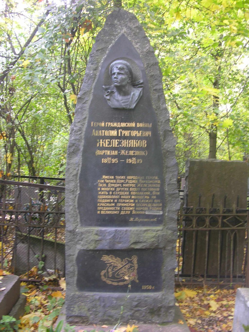 местоположение могилы Анатолия Григорьевича Железнякова с надгробным памятником 1950 года на территории Ваганьковского кладбища (согласно схеме предмета охраны); объемно-пространственная композиция и архитектурно-художественное оформление надгробия 1950 года, представляющего собой стелу из гранита, обработанную под \"дикую скалу\" с горельефным портретом Железнякова А.Г. в верхней части, графическим изображением якоря с лавровой ветвью и датой создания памятника в нижней части, в том числе основание и блоки цветника, включая габариты и высотные отметки (согласно схеме предмета охраны);шрифтовые композиции на лицевой стороне стелы: \"ГЕРОЙ ГРАЖДАНСКОЙ ВОЙНЫ АНАТОЛИЙ ГРИГОРЬЕВИЧ ЖЕЛЕЗНЯКОВ (ПАРТИЗАН – ЖЕЛЕЗНЯК) 18 20/IV 95 19 26/VII 19\" (под горельефным портретом) ниже \"..ИМЕНА ТАКИХ НАРОДНЫХ ГЕРОЕВ, КАК ЧАПАЕВ, ЩОРС, РУДНЕВ, ПАРХОМЕНКО, ЛАЗО, ДУНДИЧ, МАТРОС ЖЕЛЕЗЯКОВ И МНОГИХ ДРУГИХ БУДУТ ПОСТОЯННО ЖИТЬ В СЕРДЦАХ ПОКОЛЕНИЙ…ОНИ ВДОХНОВЛЯЮТ НАШУ МОЛОДЕЖЬ НА ПОДВИГИ И ГЕРОИЗМ И СЛУЖАТ ПРЕКРАСНЫМ ПРИМЕРОМ БЕСПРЕДЕЛЬНОЙ ПРЕДАННОСТИ СВОЕМУ НАРОДУ, РОДИНЕ И ВЕЛИКОМУ ДЕЛУ ЛЕНИНА- К. ВОРОШИЛОВ\" (согласно схеме предмета охраны);конструкция, материал (габбронорит, гранит, бронза) и виды обработки поверхностей (мелкобугристость, полировка, обработка \"под скалу\", золочение, литье, патинирование).Изменение предмета охраны может быть осуществлено в порядке и случаях, предусмотренных законодательством об объектах культурного наследия.