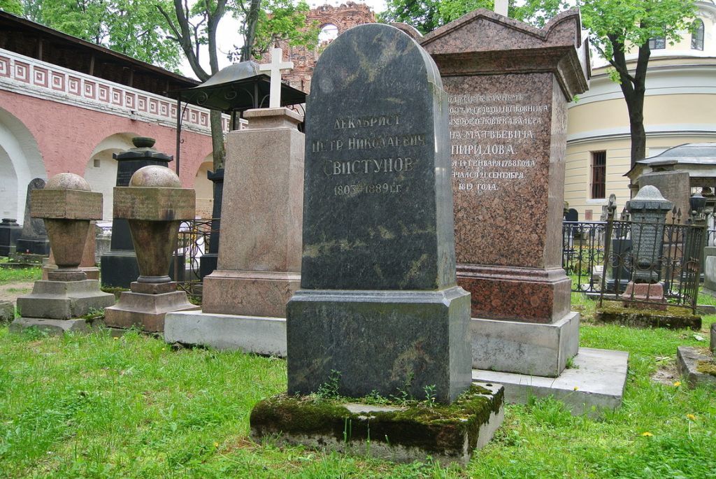 местоположение могилы с надгробием 1951 года, расположеннойв южной части некрополя Донского монастыря (согласно схеме предмета охраны);объемно-пространственная композиция и архитектурно-художественное оформление памятника 1951 года, включая прямоугольный цоколь с архитектурным профилем, трапециевидную стелу с полукруглым завершением с боковой подрезкой (согласно схеме предмета охраны), включая габариты и высотные отметки;конструкция, материал (темно-серый с бежевыми разводами гнейс), характер и виды обработки поверхностей (полировка, гравировка) памятника 1951 года;шрифтовая композиция на лицевой (восточной) стороне стелы с памятной надписью: \"ДЕКАБРИСТ ПЕТР НИКОЛАЕВИЧ СВИСТУНОВ 1803 – 1889 гг.\", включая технику нанесения (контррельеф), характер шрифта (матовые буквы на глянцевом фоне) (согласно схеме предмета охраны).Изменение предмета охраны может быть осуществлено в порядкеи случаях, предусмотренных законодательством об объектах культурного наследия.
