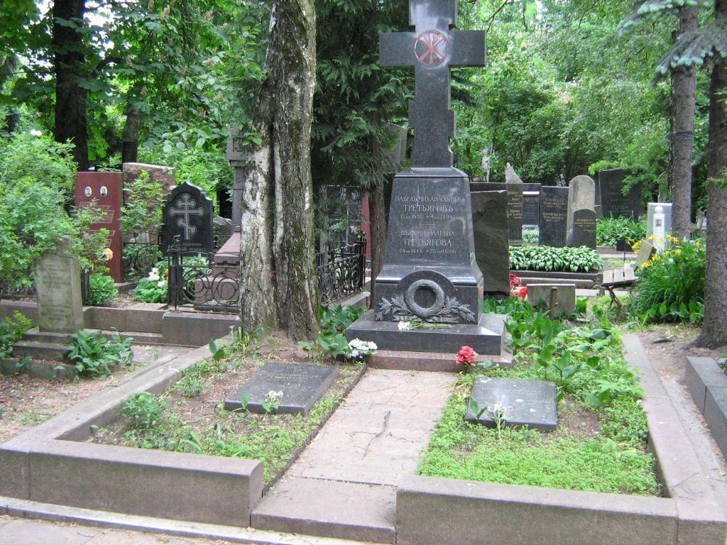 местоположение могилы с надгробием начала XX века (скульптор И.Орлов, по проекту В.М.Васнецова и И.С.Остроухова) на участке 1, их роль в композиционно-планировочной структуре северо-восточной части Новодевичьего кладбища (согласно схеме предмета охраны);объемно-пространственная композиция и архитектурно-художественное оформление надгробия начала XX века, представляющего собой широкий семиконечный крест на прямоугольном расширяющемся к низу постаменте с цоколем на двухступенчатом основании, включая врезанную в средокрестье монограмму из двух первых букв слова \"Христос\" (хризма) из порфира и бронзовый барельеф в виде лаврового венка с лавровыми ветками и лентами на цоколе, в том числе габариты и высотные отметки (согласно схеме предмета охраны); конструкция, материал (габбро, красный гранит, порфир, бронза), характер и виды обработки поверхностей (полировка, инкрустация, гравировка, литье);шрифтовые композиции с памятными надписями: \"ПАВЕЛЪ МИХАЙЛОВИЧЪ ТРЕТЬЯКОВЪ 15 дек. 1832 .г + 4 дек. 1898 г.\" (на лицевой (восточной) стороне постамента), ниже \"ВIЬРА НИКОЛАЕВНА ТРЕТЬЯКОВА 28 апр. 1844 г. + 25 мар. 1899 г.\", СЕРГIЬЙ МИХАЙЛОВИЧЪ ТРЕТЬЯКОВЪ 19 янв. 1834 г. + 25 iюля 1892 г.\" (на боковой (южной) стороне постамента), \"АЛЕКСАНДРА ПАВЛОВНА БОТКИНА УРОЖДЕННАЯ ТРЕТЬЯКОВА 23 дек. 1867 г. + 30 марта 1959 г.\" (на боковой (северной) стороне постамента), включая технику нанесения (контррельеф), характер и оформление шрифта (согласно схеме предмета охраны).Изменение предмета охраны может быть осуществлено в порядке и случаях, предусмотренных законодательством об объектах культурного наследия.