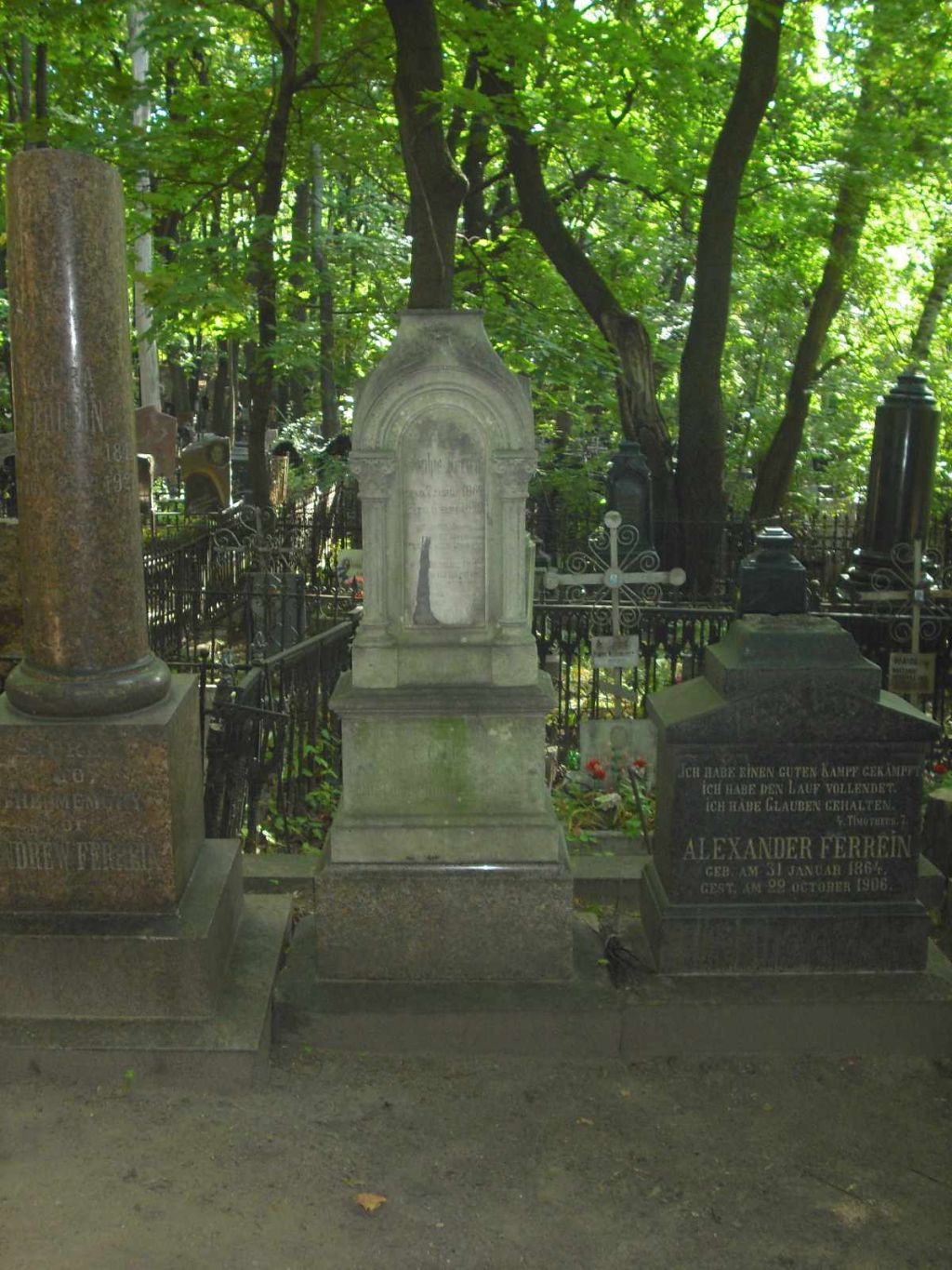 местоположение надгробия конца XIX в. на могиле Феррейн Софии (1890–1905 гг.) на семейном захоронении Феррейнов, на участке № 5-1, у южной границы, с западной стороны от надгробия А.К.Феррейна и его жены Л.Феррейн (согласно приложению к настоящему предмету охраны);объемно-пространственная композиция и архитектурно-художественное решение надгробия конца XIX в. на могиле Феррейн Софии (1890–1905 гг.), представляющего прямоугольную в плане стелу-часовенку из белого мрамора, состоящую из постамента с профилированными нижним поясом и карнизом, и верхней части с арочными порталами по сторонам, декорированными трехчетвертными угловыми колонками с каннелированными фустами и укрупненными композитными капителями, и фигурным четырехгранным навершием, включая цоколь из шлифованного розового гранита с профилем-скоцией по верхней грани и плиту-основание из песчаника (согласно приложению к настоящему предмету охраны), в том числе габариты и высотные отметки сооружения;конструкция, материал (мрамор, розовый гранит, песчаник), характер (фактура) и виды обработки поверхностей (шлифовка, резьба, гравировка), колористическое решение;шрифтовая композиция на лицевой (северной) стороне надгробия в арке с памятными надписями: \"UNSRE EINZIGE GELIEBTE TOCHTER Sophie Ferrein GEB. D. 7 JANUAR 1862. GEST. D. 6 SEPT. 1879. O WEINE NICHT! JCH BIN DIR NICHT GESTORBEN; EIN EWIG SELIG LEBEN GING MIR AUF. O SAHST DU IHN, DEN KRANZ, DEN ICH ERWORBEN, ES HEMMTE GLEICH SICH DEINER THRANEN LAUF. HIER WOHNT DER FRIEDE, LEUCHTET EWG' ES LICHT. O WEINE NICHT!\", включая технику нанесения (контррельеф), характер шрифта, покрытие (золочение) (согласно приложению к настоящему предмету охраны);шрифтовая композиция на лицевой (северной) стороне цоколя с памятной надписью: \"UNSER GELIEBTES ALTESTES GROSSKIND СОНЯ GEB. D. 9 OCT. 1890. GEST. D. 10 JAN. 1905 DIE LIEBE HÖRET NIMMER AUF.\", включая технику нанесения (контррельеф), характер шрифта, покрытие (золочение) (согласно приложению к настоящему предмету охраны).Изменение предмета охраны может быть осуществлено в порядке и случаях, предусмотренных законодательством об объектах культурного наследия.
