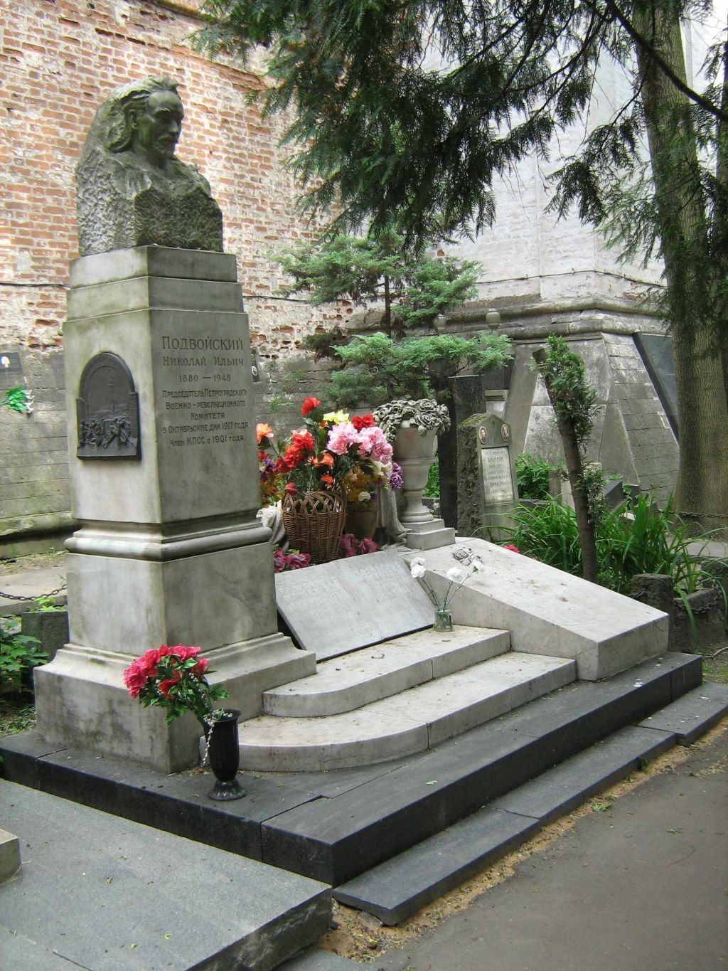 местоположение могилы с надгробием второй половины ХХ века на участке № 1 на территории Новодевичьего кладбища (согласно схеме предмета охраны);объемно-пространственная композиция и художественное оформление надгробия второй половины ХХ века, включая скульптурный портрет Н.И.Подвойского, ступенчатый постамент с цоколем, профили и подсечка, белокаменный блок с наклонной верхней плоскостью, рельефный букет из двух роз, парапет с бортиком, вазон с цветами и драпировкой уложенной \"волнами\" по бортику, две ступеньки со скругленными углами, основание из блоков, бронзовый барельеф с изображением штурма Зимнего дворца в октябре 1917 года, в том числе габариты и высотные отметки (согласно схеме предмета охраны);конструкция, материал (белый камень, белый мрамор, темно-серый гранит, бронзовое литье), характер и виды обработки поверхностей (фактурная матовая и гладкая шлифовка, полировка, рельеф, гравировка), колористическое решение;шрифтовые композиции надгробия второй половины ХХ века со словами: \"Подвойский Николай Ильич 1880−1948. Председатель Петроградского Военно-революционного Комитета В Октябрьские дни 1917 года. Член КПСС с 1901 года\" − на лицевой стороне постамента, \"Подвойская Нина Августовна 1882−1953. Член КПСС с 1902 года\" − на надгробном камне, включая технику нанесения, характер шрифта (согласно схеме предмета охраны).Изменение предмета охраны может быть осуществлено в порядке и случаях, предусмотренных законодательством об объектах культурного наследия.