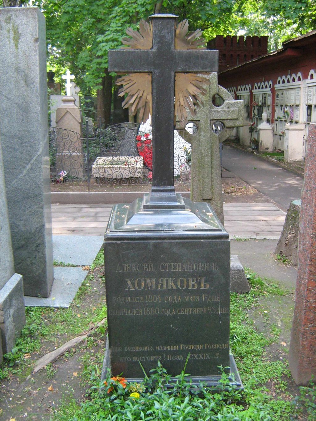 местоположение могилы с надгробием середины XIX века в северо-восточной части Новодевичьего кладбища на участке № 2 (согласно схеме предмета охраны);объемно-пространственная композиция и архитектурно-художественное оформление надгробия середины XIX века, включая крест с металлическим \"сиянием\", постамент, цоколь с профилировками, их габариты и высотные отметки (согласно схеме предмета охраны);конструкция, материал (темно-серый гранит, металл), характер и виды обработки поверхностей (полировка, шлифовка, гравировка) надгробия середины XIX века;шрифтовые композиции со словами: на лицевой стороне постамента \"АЛЕКСЕЙ СТЕПАНОВИЧ ХОМЯКОВ РОДИЛСЯ 1804 ГОДА МАЯ 1 ДНЯ СКОНЧАЛСЯ 1860 ГОДА СЕНТЯБРЯ 23 ДНЯ\", ниже церковнославянскими буквами слова псалма: \"АЩЕ БЕЗЗАКОНИЯ НАЗРИШИ, ГОСПОДИ, ГОСПОДИ, КТО ПОСТОИТ!. Псалт. СXXIX. 3\", на тыльной стороне постамента: \"ЕКАТЕРИНА МИХАЙЛОВНА ХОМЯКОВА РОЖДЕННАЯ ЯЗЫКОВА РОДИЛАСЬ 1817 ГОДА IЮЛЯ 15ГО УМЕРЛА 1852 ГОДА ЯНВАРЯ 26 ДНЯ\", ниже церковнославянскими буквами слова: \"БЛАЖЕНИ КРОТЦIИ ЯКО ТIИ НАСЛЕДЯТЪ ЗЕМЛЮ. МАТФ. V. 3.\", на боковой (западной) стороне постамента: \"АШЕ УМРУХОМЪ СО ХРИСТОМЪ ВЕРУЕМЪ ЯКО И ЖИВЫ БУДЕМ СЪ НИМЪ. Къ. Рим. Гл VI Ст. 8\", на боковой (восточной) стороне постамента: \"БЛАЖЕНИ АЛЧУЩИИ И ЖАЖДУЩИИ ПРАВДЫ ЯКО ТIИ НАСЫТЯТСЯ. МАТ. С. 5\" их местоположение, характер и обработка шрифта, техника нанесения и колористическое решение (согласно схеме предмета охраны).Изменение предмета охраны может быть осуществлено в порядке и случаях, предусмотренных законодательством об объектах культурного наследия.