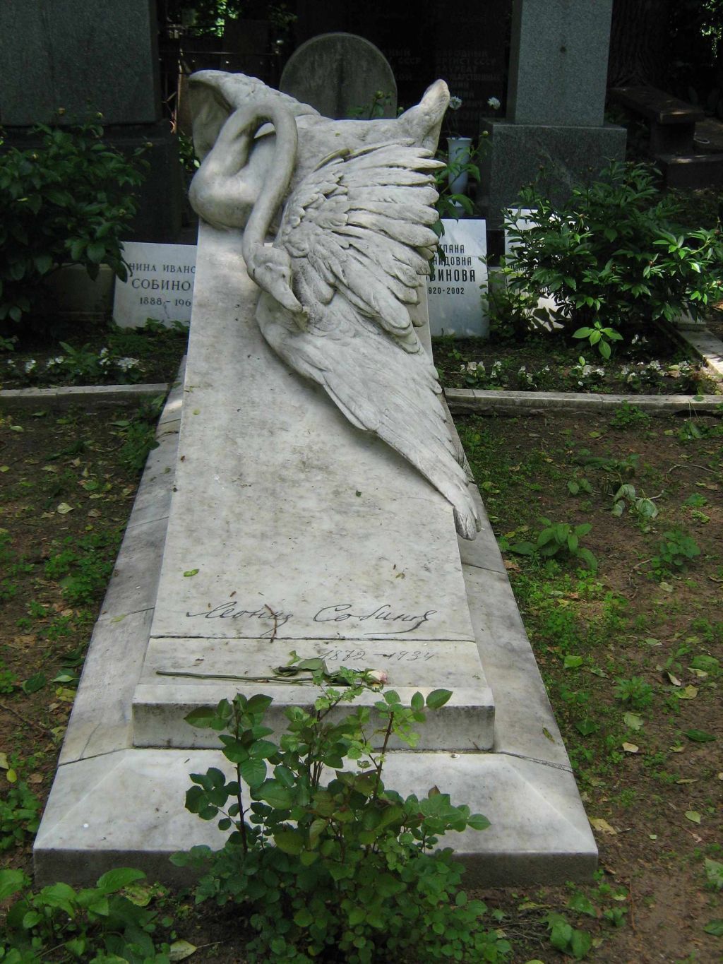 местоположение могилы с надгробием первой половины ХХ века на участке № 2 на территории Новодевичьего кладбища (согласно схеме предмета охраны);объемно-пространственная композиция памятника первой половины ХХ века, включая постамент в виде волюты, фигуру лебедя, основание памятника со скошенными боковыми гранями, белокаменную надгробную доску с фотографическим портретом Л.В.Собинова, керамический овальный медальон, ограждение участка захоронения прямоугольным бортиком с двумя малыми волютами, две прямоугольные цветочницы, две скамьи из профилированных плит, в том числе габариты и высотные отметки (согласно схеме предмета охраны);конструкция, материал (белый мрамор, белый камень), характер и виды обработки поверхностей (матовая и гладкая шлифовка, полировка, рельеф, гравировка);шрифтовые композиции первой половины ХХ века со словами: \"Леонид Собинов 1872–1934\" − на передней лицевой поверхности волюты, имена оперных персонажей, исполненных Л.В.Собиновым, на тыльном изгибе волюты, \"НАРОДНЫЙ АРТИСТ РЕСПУБЛИКИ ЛЕОНИД ВИТАЛЬЕВИЧ СОБИНОВ СКОНЧАЛСЯ 14го ОКТЯБРЯ 1934 Г.\" − на доске у основания памятника, \"Народный артист Республики Леонид Собинов. сконч. 19 14/█(Х@) 34 г \" – на белокаменной надгробной доске, включая технику нанесения (гравировка), характер шрифта, покрытие и колористическое решение (согласно схеме предмета охраны). Изменение предмета охраны может быть осуществлено в порядке и случаях, предусмотренных законодательством об объектах культурного наследия.