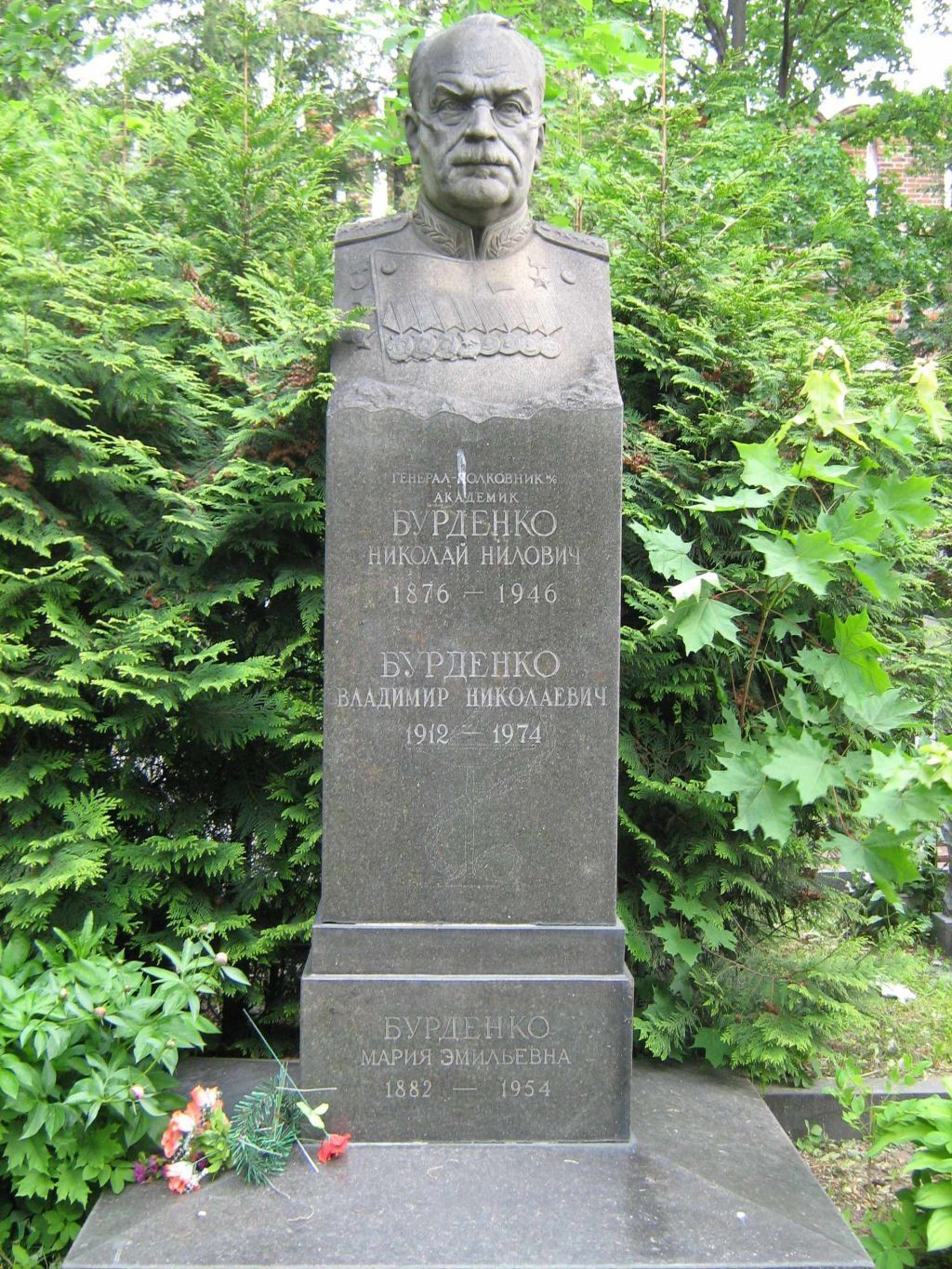 местоположение могилы с надгробием 1956 года на участке № 1 в северо-восточной части Новодевичьего кладбища (согласно схеме предмета охраны);объемно-пространственная композиция и архитектурно-художественное оформление надгробия 1956 года, включая колонну серого гранита со скульптурным портретом хирурга, выгравированным изображением чаши со змеей, гранитную плиту основания, гранитный цоколь с уступом, бортики ограждения со ступенькой, их габариты и высотные отметки (согласно схеме предмета охраны);конструкция, материал (серый гранит), характер и виды обработки поверхностей (полировка, шлифовка, гравировка), колористическое решение надгробия 1956 года;шрифтовая композиция 1956 года: \"ГЕНЕРАЛ ПОЛКОВНИК АКАДЕМИК БУРДЕНКО НИКОЛАЙ НИЛОВИЧ 1876−1946\", ее местоположение, характер шрифта, способ нанесения, колористическое решение (согласно схеме предмета охраны).Изменение предмета охраны может быть осуществлено в порядке и случаях, предусмотренных законодательством об объектах культурного наследия.