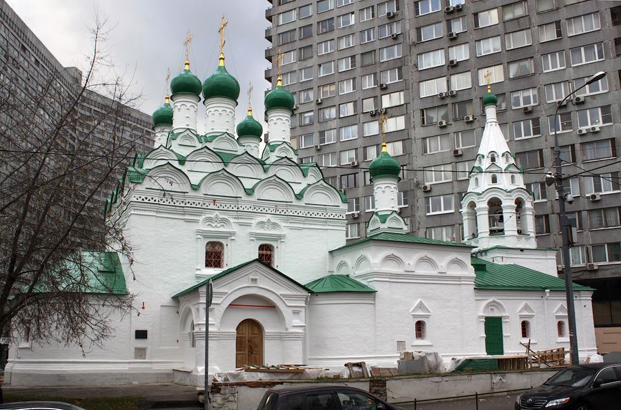 местоположение и градостроительные характеристики здания церкви 1676–1679 годов, участвующего в формировании застройки Поварской улицы и улицы Новый Арбат, его роль в композиционно-планировочной структуре владения и квартала (согласно схеме предмета охраны);объемно-пространственная композиция здания церкви 1676–1679 годов, включающая бесстолпный двусветный четверик храма, завершенный пятиглавием на горке кокошников, пониженный объем трехчастной апсиды, примыкающие к западным углам храма приделы с повышенными кубическими четвериками с глухими главками и полукруглыми апсидами, объединенные широкой трапезной, а также шатровую колокольню с открытым нижним ярусом-проходом и крыльцо у северного фасада храма, включая высотные отметки по венчающим карнизам, кокошникам, каменному шатру колокольни, разорванному фронтону крыльца (с учетом реставрационных работ 1960-х годов; согласно схеме предмета охраны);крыши и главы с крестами на конец XVII века, их конструкция, конфигурация, материал, характер кровельного покрытия, в том числе высотные отметки по конькам и главам с крестами (с учетом реставрационных работ 1960-х годов);композиционное решение и архитектурно-художественное оформление фасадов 1676–1679 годов, включая размер, форму, местоположение и оформление оконных и дверных проемов, в том числе белокаменный цоколь с профилями и валиком, угловые широкие лопатки, крепующие венчающий карниз, колончатые наличники с фигурными килевидными завершениями, наложенными на венчающий карниз четверика, и рамочные с треугольными и полукруглыми профилированными фронтонами на фасадах трапезной и приделов, венчающие профилированные карнизы, в том числе с креповками и поясами \"бегунца\" и \"поребрика\" в четверике храма, профилированные килевидные кокошники над карнизами четвериков приделов, два яруса профилированных кокошников в завершении храма и пояса кокошников в основании барабанов глав, аркатурно-колончатые пояса глухих барабанов с валиками и профилированными карнизами, а также порталы храма и трапезной на колонках с кубоватыми капителями, дыньками и перехватами на фустах, с профилированными килевидными архивольтами и нишами-киотами в тимпанах; оформление северного крыльца с двумя круглыми в сечении приземистыми столбами, украшенными профилированными тягами и ширинками, опирающиеся на них арочные проемы с широкими гладкими архивольтами и разорванный профилированный фронтон в завершении, а также четыре закладные белокаменные доски XVII и XVIII веков на фасадах храма, трапезной и приделов; оформление колокольни – четырехгранные пилоны открытого нижнего яруса-прохода с арочными проемами, декорированные профилированными карнизами и крупными ширинками, угловые лопатки верхнего закрытого яруса-палатки с маленькими окнами в рамочных наличниках, наугольные лопатки открытого яруса звона, парапет из ширинок в основании аркады, многорядная профилировка архивольтов и импостов арок звона, шатер колокольни с гуртами по граням и двумя рядами слухов, обрамленных в нижнем ряду фронтончиками, в верхнем – арочками, опирающимися на пилястры (с учетом реставрационных работ 1960-х годов; согласно схеме предмета охраны);материал и характер оформления столярных заполнений оконных и дверных проемов на конец XVII века, в том числе кубоватые оконные реше