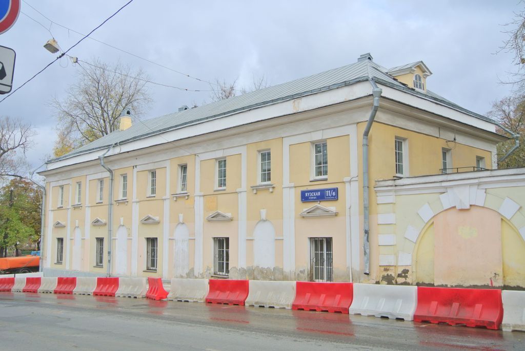 1.\"Служебный корпус\", конец XVIII века (г. Москва, Яузская ул., д. 11/6, стр. 11):местоположение и градостроительные характеристики здания 1796— 1805 годов, участвующего в формировании фронта застройки Яузской улицы, его роль в композиционно-планировочной структуре ансамбля и квартала (согласно схеме предмета охраны);объемно-пространственная композиция прямоугольного в плане двухэтажного здания 1796-1805 годов с пристройкой конца XIX - началаXIXвека (согласно схеме предмета охраны), в том числе высотные отметки по венчающим карнизам, аттику и фронтону;крыши, их конфигурация, материал, характер кровельного покрытия, в том числе высотные отметки по конькам, слуховые окна, печные трубы;композиционное решение и архитектурно-художественное оформление фасадов 1796-1805 годов, конца XIX - начала XX века, включая размер, форму, местоположение и оформление оконных и дверных проемов, в том числе белокаменный цоколь, лопатки, ниши, в том числе прямоугольные, арочные, замковые камни, тяги, треугольные сандрики, подоконные полочки, фриз, венчающий профилированный карниз, аттик, фронтон с лепным вензелем И.В.Баташева - \"IB\" в тимпане (согласно схеме предмета охраны);материал и характер отделки фасадных поверхностей конца XVIII - XIX веков, включая белый камень, гладкую штукатурку по кирпичной кладке;колористическое решение фасадов XVIII - XIX веков (уточняется по результатам реставрационных исследований и раскрытий);пространственно-планировочная структура интерьеров здания в пределах капитальных стен, пилонов, прямоугольных и арочных проемов, перегородок и перекрытий 1796-1805 годов, конца XIX - начала XX века;капитальные стены, пилоны и перекрытия 1796-1805 годов, конца XIX - начала XX века, их конструкции и материал, включая сводчатые перекрытия (согласно схеме предмета охраны);лестница XIX века, ее местоположение, конструкция, материал, характер оформления (согласно схеме предмета охраны);архитектурно-художественное оформление интерьеров здания 1796— 1805 годов, конца XIX - начала XX века, включая профилированные карнизы пилонов в основании подпружных арок, печи (согласно схеме предмета охраны);столярные заполнения оконных и дверных проемов конца XVIII - XIX веков, их материал, характер оформления, колористическое решение.Изменение предмета охраны может быть осуществлено в порядке и случаях, предусмотренных законодательством об объектах культурного наследия.
