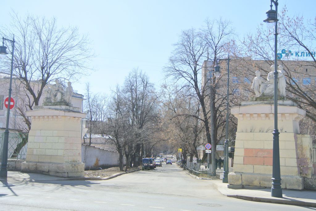Два пилона ворот с двумя белокаменными скульптурными группами