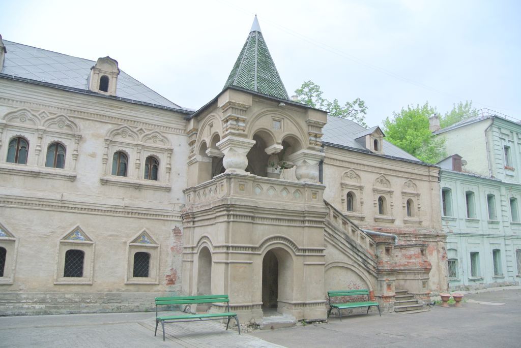 местоположение и градостроительные характеристики здания, его роль в композиционно-планировочной структуре ансамбля (согласно схеме предмета охраны); объемно-пространственная композиция двухэтажного, с подвалом здания XVI–XVII веков, включая крыльцо с шатровым завершением XIX века, (согласно схеме предмета охраны), в том числе высотные отметки по венчающим карнизам;крыши, шатры XIX века, их материал, конструкция, конфигурация, характер кровельного покрытия, чердачные окна с треугольными и килевидными сандриками, печные трубы, высотные отметки по конькам и шатрам (уточняется в процессе реставрационных исследований);композиционное решение и архитектурно-художественное оформление фасадов XVI–XVII веков, XIX века, в том числе местоположение, форма, размер, оформление оконных и дверных проемов, поребрик, оформление крыльца (фигурные столбы, филенки), изразцы, профилированные карнизы (согласно схеме предмета охраны); художественный металл: железные подстава, жиковины, ручки, кованые решетки (уточняется в процессе реставрационных исследований);материал и характер отделки фасадных поверхностей XVI–XVII веков, XIX века, включая обмазку кирпичной кладки, штукатурку, изразцы, белый камень, художественный металл (уточняется в процессе реставрационных исследований); колористическое решение фасадов XVI–XVII веков, XIX века (уточняется в процессе реставрационных исследований); пространственно-планировочная структура интерьеров XVI–XVII веков, XIX века в пределах капитальных стен и перекрытий, включая сводчатые (согласно схеме предмета охраны);капитальные стены и перекрытия, в том числе своды XVI–XVII веков, XIX века, металлические связи, их конструкции и материал (согласно схеме предмета охраны);архитектурно-художественное оформление интерьеров XVI–XVII веков, XIX века, в том числе росписи стен, виды покрытия пола: белокаменные, доломитовые, кирпичные (уточняется в процессе реставрационных исследований);колористическое решение интерьеров XVI–XVII веков, XIX века (уточняется в процессе реставрационных исследований);изразцовые печи XVI–XIX веков, их местоположение, конструкция, материал, оформление, включая печной прибор (уточняется в процессе реставрационных исследований; согласно схеме предмета охраны);столярные заполнения оконных и дверных проемов XIX века, их материал, характер оформления, колористическое решение, скобяной прибор (уточняется в процессе реставрационных исследований).Изменение предмета охраны может быть осуществлено в порядке и случаях, предусмотренных законодательством об объектах культурного наследия.