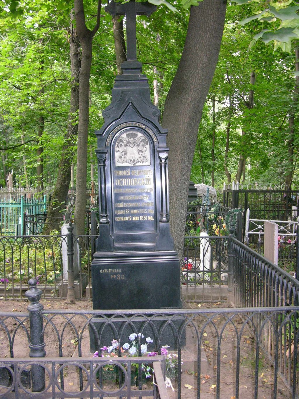 местоположение могилы 1831 года с надгробием последнейтрети XIX века, расположенной в северной части Ваганьковского кладбищана участке № 11 (согласно схеме предмета охраны);объемно-пространственная композиция надгробия последнейтрети XIX века, включая бетонную плиту, профилированное основаниеиз серого гранита, стелу-голгофу, фигурный крест, их габариты и высотные отметки (согласно схеме предмета охраны);архитектурно-художественное оформление надгробия последнейтрети XIX века, включая арочные перспективные ниши с килевидными архивольтами и гранеными трехчетвертными колонками, фигурный крестна профилированном основании стелы-голгофы, в том числе белокаменная плита с рельефным изображением дворянского герба Осиповских;конструкция, материал (полированный габбро, темно-серый и красный гранит, белый камень), характер и виды обработки поверхностей (полировка, шлифовка, гравировка, резьба), колористическое решение надгробия последней трети XIX века;шрифтовые композиции: \"ПЕРВЫЙ ЗНАМЕНИТЫЙ РУССКIЙ МАТЕМАТИК\"; \"ТИМОФЕЙ ФЕДОРОВИЧЪ ОСИПОВСКIЙ РЕКТОРЪ ХАРЬКОВСКАГО УНИВЕРСИТЕТА ЗАСЛУЖЕННЫЙ ПРОФЕССОРЪ ВЫСШЕЙ МАТЕМАТИКИ И АСТРОНОМIИ РОДИЛСЯ 22 ЯНВАРЯ1765 ГОДА СКОНЧАЛСЯ 12 JЮНЯ 1831 ГОДА\" с покрытием золотой краской; авторская надпись: \"РАБ. И.А.ПАВЛОВ НА НЕМЕЦК. КЛАДБЕЩИ В МОСКВ.\" на матовом поле рельефными буквами, обработанными полировкой, их местоположение, техника нанесения (контррельеф), характер шрифта, способ нанесения (согласно схеме предмета охраны);ажурная металлическая ограда конца XIX века с круглыми в сечении столбиками и калиткой, включая материал, конструкцию, оформление и колористическое решение (согласно схеме предмета охраны).Изменение предмета охраны может быть осуществлено в порядке и случаях, предусмотренных законодательством об объектах культурного наследия.