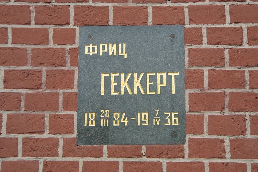местоположение урны с прахом Ф.Геккерта в колумбарной нише в стене Московского Кремля между Сенатской и Никольской башнями, ее роль в композиционно-планировочной структуре некрополя Красной площади (согласно схеме предмета охраны);плита 1930-х годов, закрывающая колумбарную нишу, ее форма, размеры, материал (черный гранит), характер и вид обработки лицевой поверхности (шлифовка, полировка, гравировка), колористическое решение, включая винты крепления по четырем углам (согласно схеме предмета охраны);мемориальная посвятительная надпись на лицевой стороне плиты \"ФРИЦ ГЕККЕРТ 18 28/III 84 - 19 7/IV 36\", включая ее местоположение, характер оформления, технику врезки (контррельеф, характер шрифта) и колористическое решение (золочение) (согласно схеме предмета охраны).Изменение предмета охраны может быть осуществлено в порядке и случаях, предусмотренных законодательством об объектах культурного наследия.