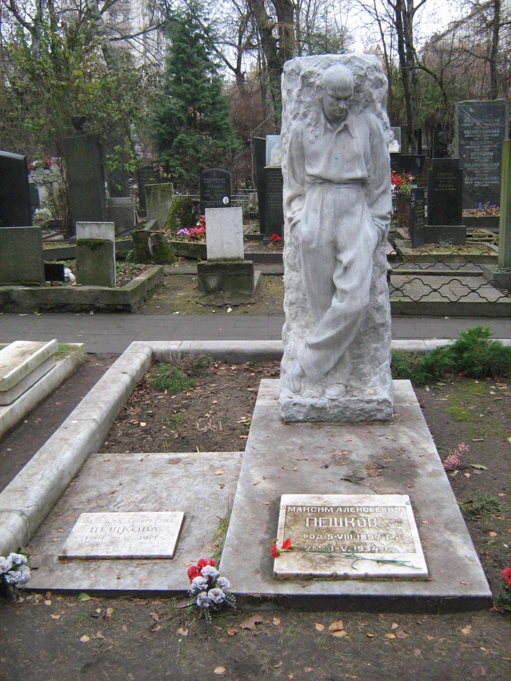 местоположение надгробия 1936 года на могиле М.А.Пешкова, расположенного на участке № 2, в ряду № 22, на территории Новодевичьего кладбища (согласно приложению к настоящему предмету охраны);объемно-пространственная композиция и архитектурно-художественное оформление надгробия 1936 года, включая вертикальную глыбу серого уральского мрамора с поверхностью скола камня, горельефный портрет – ростовую фигуру М.А.Пешкова, прямоугольную надгробную плиту, квадратную беломраморную доску с памятной надписью, в том числе габариты и высотные отметки сооружения, а также бортик по периметру из мраморных блоков со скругленным углом с внутренней стороны, скамейку на прямоугольной плите-основании, круглую вазу-цветочницу на плите-подставке (согласно приложению к настоящему предмету охраны);конструкция, материал (мрамор), характер и виды обработки поверхностей (шлифовка, гравировка), включая колористическое решение памятника;шрифтовая композиция на заглубленном прямоугольном поле беломраморной доски: \"МАКСИМ АЛЕКСЕЕВИЧ ПЕШКОВ РОД. 9-VIII.1897 Г. УМ.11-V. 1934 Г.\", включая ее местоположение, технику нанесения (рельеф), характер шрифта и оформление (согласно приложению к настоящему предмету охраны). Изменение предмета охраны может быть осуществлено в порядке и случаях, предусмотренных законодательством об объектах культурного наследия.