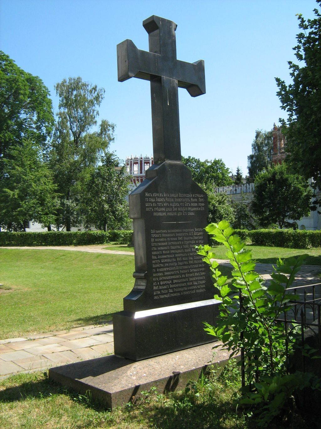 Предметом охраны объекта культурного наследия регионального значения (памятника) \"Могила Богданова Анатолия Петровича (1834–1896)\", расположенного по адресу (местонахождение): г. Москва, Старое кладбище быв. Новодевичьего монастыря, являются:местоположение могилы А.П.Богданова с надгробным памятником конца XIX века в центральной части Новодевичьего монастыря, у юго-западного угла Смоленского собора (согласно приложению к настоящему предмету охраны);объемно-пространственная композиция и архитектурно-художественное оформление надгробного памятника конца XIX века, включая плиту-основание, цоколь с прямоугольной фаской, стелу-голгофу со сложным фигурным абрисом и торцевыми профилировками, четырехконечный фигурный крест, ниша-киот с килевидным завершением на лицевой стороне стелы, памятная доска, круглый медальон с рельефным глянцевым изображением монограммного креста на светлом матовом поле в перекрестии креста, в том числе габариты и высотные отметки сооружения (согласно приложению к настоящему предмету охраны);конструкция, материал (черный и красный гранит, светло-серый мрамор), характер и виды обработки поверхностей (полировка, шлифовка, гравировка), включая колористическое решение надгробия;шрифтовая композиция с памятной надписью на лицевой стороне стелы в цокольной части: \"АНАТОЛIЙ ПЕТРОВИЧЪ БОГДАНОВЪ РОДИЛСЯ 1 ОКТЯБРЯ 1834 – СКОНЧАЛСЯ 16 МАРТА 1896.\", на мраморной доске, установленной в нише-киоте на лицевой стороне стелы: \"ЕЛЛИЙ АНАТОЛЬЕВИЧ БОГДАНОВ ПРОФЕССОР ТИМИРЯЗЕВСКОЙ СЕЛЬХОЗ. АКАДЕМИИ РОДИЛСЯ 5 МАЯ 1872 г. УМЕР 14 ОКТЯБРЯ 1931 г.\", на тыльной стороне стелы: \"ЖИЛЪ, ВѢРЯ ВЪ БОГА, ОЖИДАЯ ВОСКРЕСЕНIЯ И СТРАШНА-ГО СУДА. ЛЮБИЛЪ РОССIЮ, УНИВЕРСИТЕТЪ, НАУКУ. ПЕРЕ-ШЕЛЪ ВЪ ТОТЪ МIРЪ, НАДѢЯСЬ, ЧТО БОГЪ ЛЮБВИ ПОМИ-ЛУЕТЪ ГРѢШНУЮ ДУШУ, ЕМУ ВСЕЦѢЛО ПРЕДАННУЮ И ЕГО ЛЮБИВШУЮ, ЖИВШУЮ ДЛЯ ЕГО СЛАВЫ.\", в нижней части \"СЕЙ ПАМЯТНИКЪ ЗАСЛУЖЕННОМУ ПРОФЕССОРУ ИМПЕРАТОРСКАГО МОСКОВСКАГО УНИВЕРСИТЕТА А.П.БОГДАНО-ВУ СООРУЖЕНЪ ПО ПОЧИНУ ИМП. ОБЩЕСТВА ЛЮБИТЕЛЕЙ ЕСТЕСТВОЗНАНIЯ, АНТРОПОЛОГIИ И ЭТНОГРАФIИ НА СРЕД-СТВА НАЗВАННАГО ОБЩЕСТВА, А ТАКЖЕ КОМИТЕТА МОС-КОВСКАГО МУЗЕЯ ПРИКЛАДНЫХЪ ЗНАНИЙ, ИМП. РУССК. ОБЩ. АККЛИМАТИЗАЦIИ ЖИВОТНЫХЪ И РАСТЕНIЙ И КО-МИТЕТА ШЕЛКОВОДСТВА ИМП. МОСК. ОБЩ. СЕЛЬСКАГО ХОЗЯЙСТВА, ПРИ УЧАСТIИ ОБЩЕСТВЪ: ИМП. МОСКОВСКА-ГО АРХЕОЛОГИЧЕСКАГО, ЕСТЕСТВОИСПЫТАТЕЛЕЙ ПРИ КА-ЗАНСКОМЪ УНИВЕРСИТЕТѢ, РУССКАГО ЭНТОМОЛОГИЧЕС-КАГО, АНТРОПОЛОГИЧЕСКИХЪ ВЪ БЕРЛИНѢ, ВѢНѢ, ПАРИ-ЖѢ И ФЛОРЕНЦIИ, ФРАНЦУЗСКАГО ЗООЛОГИЧЕСКАГО, ИМП. ВОЛЬНАГО ЭКОНОМИЧЕСКАГО, МОСК. ОБЩ. ПТИЦЕВО-ДСТВА, РУССК. ОБЩ. ПЧЕЛОВОДСТВА И МНОГИХЪ ЧАСТНЫХЪ ЛИЦЪ, ТОВАРИЩЕЙ, УЧЕНИКОВЪ И ПОЧИТАТЕЛЕЙ ПОКОЙНАГО.\", на торцевой стороне памятника в цокольной части надпись-клеймо изготовителя памятника: \"М. КУТЫРИНЪ БОЛ. САДОВАЯ 159 ВЪ МОСКВѢ\", включая ее местоположение, технику нанесения (рельеф, контррельеф), характер шрифта и оформление шрифта (полированные рельефные буквы и цифры, матовые светлые буквы на темном глянцевом фоне), покрытие (золочение), колористическое решение (согласно приложению к настоящему предмету охраны).Изменение предмета охраны может быть осуществлено в порядке и случаях, предусмотренных законодательством об объектах культурного наследия.