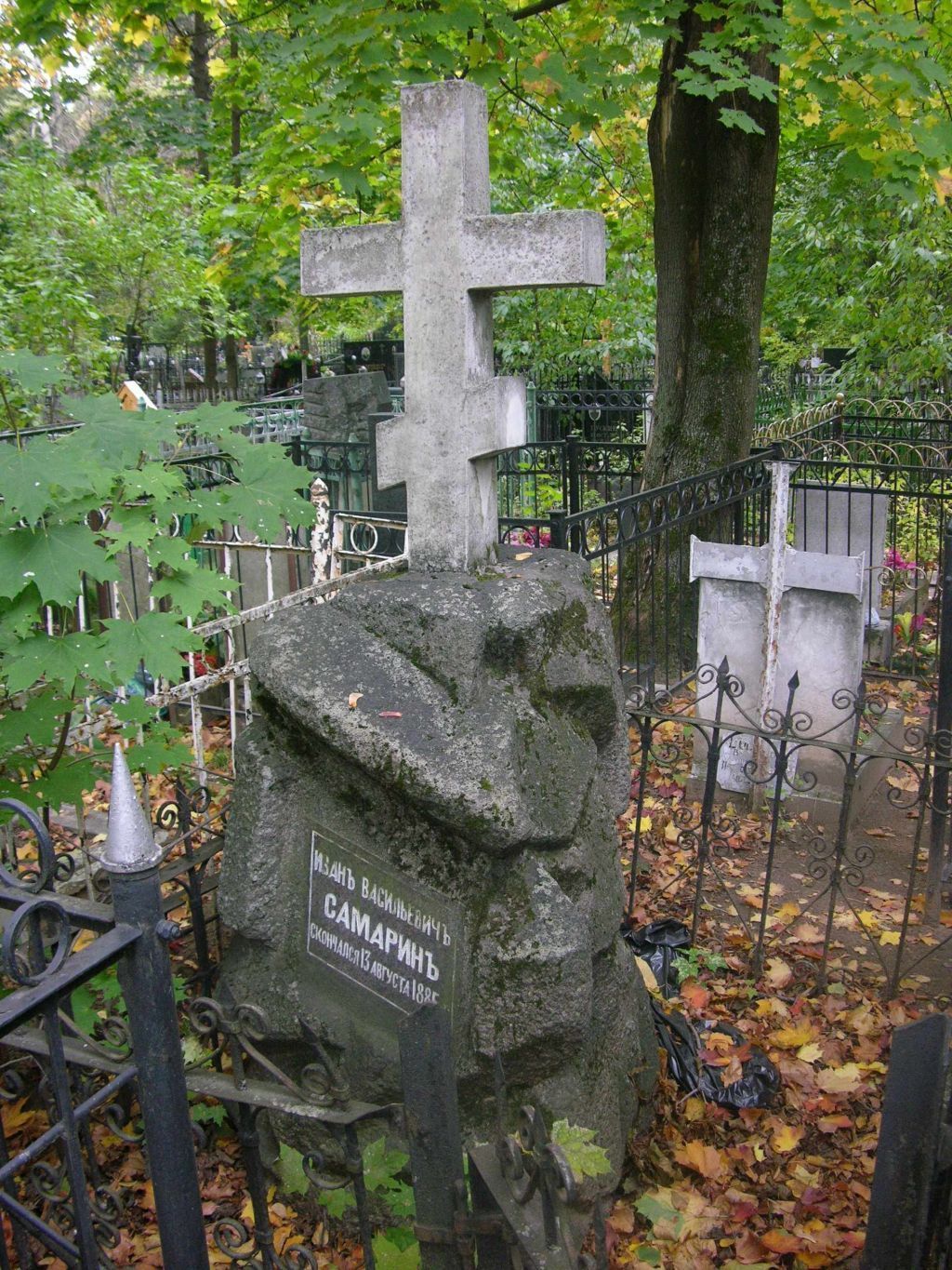 местоположение могилы русского актера и педагога Самарина Ивана Васильевича, с надгробным памятником конца 1880-х годов, в центральной части Ваганьковского кладбища на участке № 25 (согласно схеме предмета охраны); объемно-пространственная композиция и оформление памятника конца 1880-х годов, представляющего крупный гранитный камень, обработанный под \"дикую скалу\", увенчанный белым мраморным крестом, с памятной надписью на лицевой стороне, оформленной в виде прямоугольной с наклоном таблички, включая габариты и высотные отметки (согласно схеме предмета охраны); конструкция, материал (темно-серый гранит, белый мрамор), характер и виды обработки поверхностей (шлифовка, полировка, фактурная обработка \"под скалу\", гравировка);шрифтовая композиция на лицевой стороне камня с памятной надписью: \"ИВАНЪ ВАСИЛЬЕВИЧЪ САМАРИНЪ СКОНЧАЛСЯ 13 АВГУСТА 1885 Г.\", включая технику нанесения (гравировка), характер шрифта и оформление (согласно схеме предмета охраны).Изменение предмета охраны может быть осуществлено в порядке и случаях, предусмотренных законодательством об объектах культурного наследия.