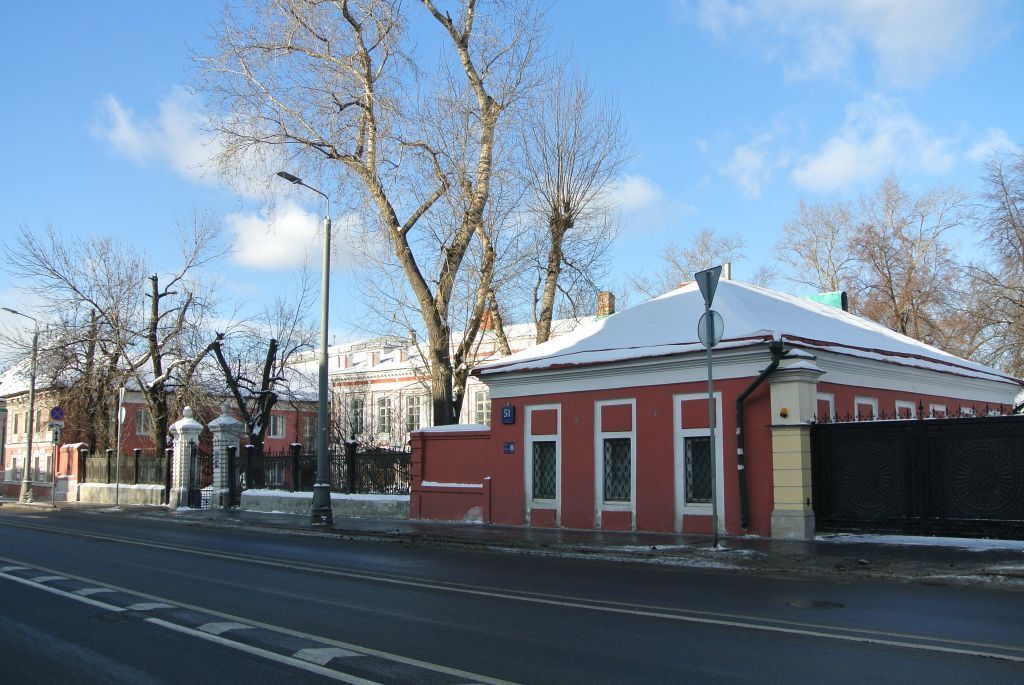 1. Ансамбль:местоположение и градостроительные характеристики ансамбля XVIII–XIX веков, участвующего в формировании фронта застройки Николоямской улицы, его роль в композиционно-планировочной структуре квартала (согласно схеме предмета охраны);объемно-пространственная композиция ансамбля конца XVIII – XIX века (согласно схеме предмета охраны), в том числе габариты, высотные и силуэтные характеристики зданий и ограды;пространственно-планировочная структура ансамбля конца XVIII – XIX века, включая соотношение застроенных и незастроенных пространств, местоположение и композиционное взаимодействие зданий и ограды (согласно схеме предмета охраны).2. \"Главный дом\", XVIII в. (г. Москва, Николоямская ул., д. 51, стр. 1):местоположение и градостроительные характеристики здания конца XVIII – XIX века, расположенного в глубине парадного двора, его роль в композиционно-планировочной структуре ансамбля и квартала (согласно схеме предмета охраны);объемно-пространственная композиция двухэтажного с подвалом и антресолью здания конца XVIII – XIX века (согласно схеме предмета охраны), включающая треугольный фронтон, в том числе высотные отметки по венчающим карнизам, аттику и парапету ограждения;крыша XIX века, ее конфигурация, материал, характер кровельного покрытия, в том числе слуховые окна, печные трубы, включая высотные отметки по конькам;композиционное решение и архитектурно-художественное оформление фасадов здания конца XVIII – XIX века, в том числе размер, форма, местоположение и оформление оконных и дверных проемов, белокаменный цоколь, рамочные профилированные наличники окон с двумя обводами и замковыми камнями в виде консолей с цветочной гирляндой, криволинейные подоконные филенки с лепниной в виде цветочных гирлянд, междуэтажный и венчающий карнизы, декоративное оформление карниза \"сухариками\", тяги, лепной фриз, каннелированные ионические пилястры в простенках, рустованные лопатки, металлические козырьки над входом, в том числе воссозданный декор XVIII века северного фасада (три пилястры большого ордера на рустованных столбах), аттик в кирпичных раскрепованных столбиках с филенками на передней грани, столбики ограждения крыши (с учетом реставрационных работ 1970-х годов) (согласно схеме предмета охраны);материал и характер отделки фасадных поверхностей XIX века, включая белокаменный цоколь, руст, гладкую штукатурку с окраской;колористическое решение фасадов XIX века (уточняется в процессе реставрационных исследований);пространственно-планировочная структура интерьеров здания в пределах капитальных стен, перегородок и перекрытий конца XVII века, конца XVIII –XIX века (согласно схеме предмета охраны);капитальные стены, перегородки и перекрытия, в том числе сводчатые, конца XVII века, конца XVIII – XIX века, их конструкции и материал (согласно схеме предмета охраны);архитектурно-художественное оформление интерьеров XIX века, включая мраморные подоконники, лепной декор, в том числе полихромный, с использованием позолоты (розетки, карнизы, плафоны и падуги анфилад первого и второго этажей), напольное мощение вестибюля из кирпича в \"елку\", наборный паркет, две коринфские колонны искусственного мрамора на верхней площадке парадной лестницы, стенные филенки в тянутом обрамлении, элементы оформления фасадов XVII–XVIII веков в интерьере, орнаментальная с растител
