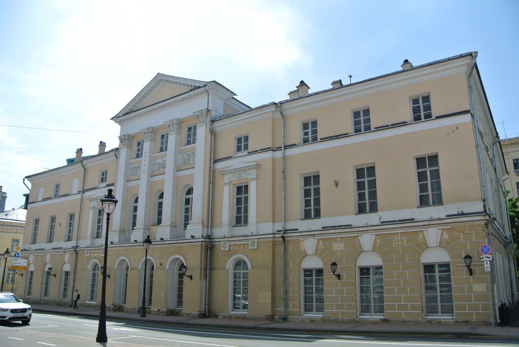 местоположение и градостроительные характеристики здания, формирующего угол Большой Никитской улицы и Романова переулка, его роль в композиционно-планировочной структуре квартала (согласно схеме предмета охраны);объемно-пространственная композиция трехэтажного прямоугольного в плане здания XVIII - первой четверти XIX века, в том числе высотные отметки по венчающим карнизам (согласно схеме предмета охраны);крыша XIX века, ее конструкция, конфигурация, материал и характер кровельного покрытия, высотные отметки по конькам;композиционное решение и архитектурно-художественное оформление фасадов XVIII - первой четверти XIX века, в том числе местоположение, форма, размер и оформление оконных, дверных проемов, выступающий пилястровый портик коринфского ордера, антаблемент, увенчанный треугольным фронтоном, скульптурные барельефы на античные сюжеты (скульптор С.П. Кампиони), профилированные междуэтажные тяги, венчающие карнизы (согласно схеме предмета охраны);материал и характер отделки фасадных поверхностей XVIII - первой четверти XIX века, включая белокаменные цоколь и детали, окраска по кирпичной кладке;колористическое решение фасадов XVIII - первой четверти XIX века (уточняется в процессе реставрационных исследований);пространственно-планировочная структура интерьеров здания в пределах капитальных стен, перекрытий, перегородок, дверных и арочных проемов XVIII - первой четверти XIX века (согласно схеме предмета охраны);капитальные стены, перегородки, плоские и сводчатые перекрытия (коробовые, цилиндрические, парусные, крестовые) XVIII - первой четверти XIX века, их конструкция и материал (согласно схеме предмета охраны);лестницы XIX века, их местоположение, конструкции, материал и декоративное оформление (согласно схеме предмета охраны);архитектурно-художественное оформление интерьеров XVIII - первой четверти XIX века, в том числе наборный паркет, деревянные резные панели, отделка стен \"зеркалами\" из искусственного мрамора, подоконники из мрамора, колонны, кариатиды, поддерживающие потолочную балку, лепнина (плафоны, розетки), профилированные карнизы (согласно схеме предмета охраны);живопись XIX века (уточняется в процессе реставрационных исследований);осветительные приборы (люстры на втором, третьем этажах) (уточняется в процессе реставрационных исследований);колористическое решение интерьеров XVIII - первой четверти XIX века (уточняется в процессе реставрационных исследований);камины и печи с прибором XIX века, их местоположение, материал и декоративное оформление, в том числе деревянная резная отделка, керамические вставки, мраморная облицовка каминов (согласно схеме предмета охраны);материал и характер оформления столярных заполнений оконных и дверных проемов XVIII - первой четверти XIX века, их колористическое решение.Изменение предмета охраны может быть осуществлено в порядке и случаях, предусмотренных законодательством об объектах культурного наследия.