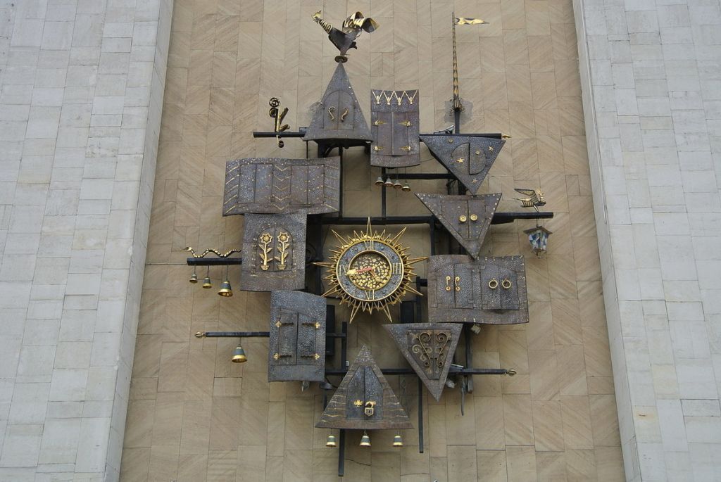 местоположение декоративных часов 1970 года на главном фасаде главного корпуса Театра кукол им. С.В.Образцова (согласно схеме предмета охраны);объемная композиция декоративных часов, состоящая из двенадцати геометрических фигур, расположенных на несущих конструкциях, в виде домиков с открывающимися дверцами, вокруг центральной фигуры – солнца, включая их оформление декоративными фигурами петуха, птицы, змеи, дерева, флагштока, колокольчиков (согласно схеме предмета охраны);композиционное решение и художественное оформление декоративных часов 1970 года, включая двенадцать объемных движущихся фигур животных и птиц (ослика, совы, вороны, зайца, лисы, обезьяны, кота, барана, поросенка, козы, волка, медведя), расположенных по кругу в домиках и соответствующих определенному часу суток;круглый циферблат, расположенный в центре часов, в виде солнцас девятью большими лучами и двадцатью семью малыми лучами; колористическое решение часов 1970 года;материал и технология изготовления часов на 1970-е годы: конструктивные элементы – черный металл с покраской; двенадцать объемных фигур – с металлическими скелетами-каркасами (распоряжение Департамента культурного наследия города Москвы от 28 декабря 2023 г. № 796) и формовкой из стекло-волоконного материала по деревянным моделям с декоративной раскраской; мелкая пластика – черный металл с покраской и позолотой сусальным золотом по лаку мордан; домики – нержавеющая сталь и черный металл с покраской; циферблат часов с лучами – позолоченный по лаку мордан черный металл и мозаика из искусственного материала (смальта);музыкально-акустическое сопровождение боя часов (мелодия песни \"Во саду ли, в огороде\", аранжированная композитором Н.В.Богословским) (распоряжение Департамента культурного наследия города Москвы от 28 декабря 2023 г. № 796).Изменение предмета охраны может быть осуществлено в порядке и случаях, предусмотренных законодательством об объектах культурного наследия.