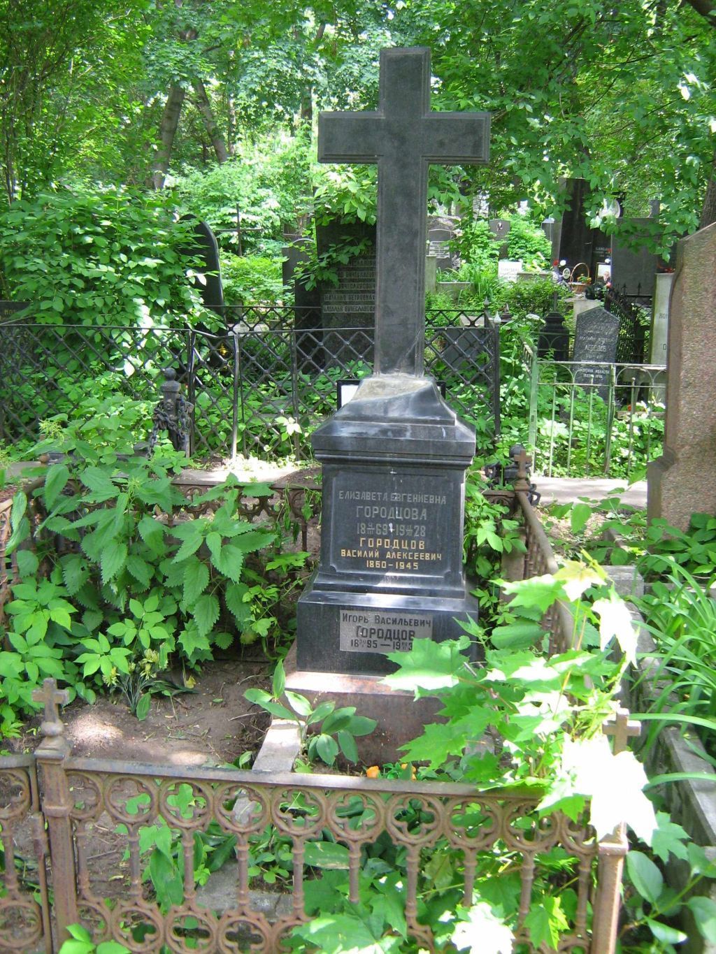 местоположение могилы с надгробием начала XX века на участке № 3, их роль в композиционно-планировочной структуре северо-западной части Новодевичьего кладбища (согласно схеме предмета охраны); объемно-пространственная композиция и архитектурно-художественное оформление надгробия начала XX века, представляющего собой латинский крест на прямоугольном постаменте с цоколем, оформленным профилировками, установленный на гранитную плиту основания, в том числе габариты и высотные отметки (согласно схеме предмета охраны);конструкция, материал (габбро, розовый гранит), характер и виды обработки поверхностей (полировка, шлифовка, гравировка) начала XX века;шрифтовые композиции начала XX века: \"ЕЛИЗАВЕТА ЕВГЕНИЕВНА ГОРОДЦОВА 18 4/III 69 – 19 11/XII 28 ГОРОДЦОВ ВАСИЛИЙ АЛЕКСЕЕВИЧ 1860 – 1945\" (на лицевой стороне постамента, на заглубленном фоне в прямоугольной рамке с вогнутыми уголками), имя изготовителя \"Н.А.ЗАХАРОВЪ МОСКВА\" (на боковой (правой) грани цоколя), включая технику нанесения (контррельеф), характер шрифта, колористическое решение (согласно схеме предмета охраны);металлическая ограда с калиткой начала XX века по границе захоронения с ажурными решетками и угловыми столбиками, ее местоположение, конструкция, материал (чугунное литье), оформление, колористическое решение.Изменение предмета охраны может быть осуществлено в порядке и случаях, предусмотренных законодательством об объектах культурного наследия.