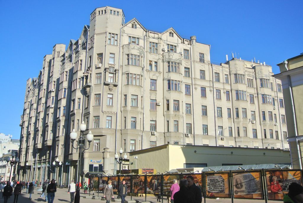 местоположение и градостроительные характеристики здания 1914 года, участвующего в формировании застройки улицы Арбат, Кривоарбатскогои Калошного переулков, его роль в композиционно-планировочной структуре владения и квартала (согласно приложению к настоящему предмету охраны);объемно-пространственная композиция шести-семиэтажного частьюс цокольным этажом и частью с подвалом здания 1914 года, представляющего в плане замкнутую периметральную композицию с внутренним двором, в том числе ризалиты, трехгранные эркеры, две угловые башни (согласно приложению к настоящему предмету охраны), включая высотные отметки по венчающим карнизам, башням, аттикам и щипцовым завершениям;крыши на 1914 год, их конфигурация, материал и характер кровельного покрытия, высотные отметки по конькам;композиционное решение и архитектурно-художественное оформление фасадов 1914 года, включая местоположение, размер, форму и оформление оконных и дверных проемов, в том числе наличники, висячие парные и одиночные граненые полуколонки в простенках верхних этажей, плоские надоконные доски, замковые камни, филенки, ниши, колонки, консоли, профилированные тяги эркеров и подоконные пояски с сухариками, барельефы в оформлении порталов парадных входов с изображениями женских фигур и фигур животных; скульптурные картуши, лепной орнаментальный и геометрический декор, волюты, композиции с парами отдельно стоящих колонн, несущих антаблементы и опирающихся на карнизные плитыс лепными консолями, две скульптуры рыцарей в доспехах с мечами, установленные в нишах, пояса с рядами дентикул, междуэтажные тягии венчающий карниз, машикули венчающего карниза дворовых фасадов(с учетом реставрационных работ 2015–2023 годов; согласно приложениюк настоящему предмету охраны);материал и характер отделки фасадных поверхностей 1914 года: цоколь, облицованный гранитом, гладкий и фактурный руст, штукатурка, имитирующая каменную облицовку, гладкая штукатурка с окраской, окраска по кирпичной кладке;колористическое решение фасадов 1914 года;пространственно-планировочная структура интерьеров зданияв пределах капитальных стен и перекрытий 1914 года (согласно приложениюк настоящему предмету охраны);капитальные стены и перекрытия 1914 года, их конструкция и материал, включая сводчатое перекрытие заложенной проездной арки (согласно приложению к настоящему предмету охраны);лестницы 1914 года, их местоположение, конструкция, материал, декоративное оформление, включая металлические ажурные ограждения лестничных маршей с деревянными профилированными поручнями,в том числе фонари на парадных лестницах первого этажа,их местоположение, конструкция и материал (согласно приложениюк настоящему предмету охраны);архитектурно-художественное оформление интерьеров общественных зон 1914 года, включая деревянные тамбуры парадных входов с резными архитравами и карнизами, деревянные филенчатые панели стен, парные витые колонки на фигурных консолях и опирающиеся на них резные балки потолков, звезчатый декор потолков из деревянных ромбов с розеткамина средокрестиях в оформлении вестибюлей парадных входов, в том числе профилированные и лепные карнизы, розетки, орнаментальные плафоны, архитектурный и лепной декор потолков парадных залов (согласно приложению к настоящему предмету охраны);столярные за
