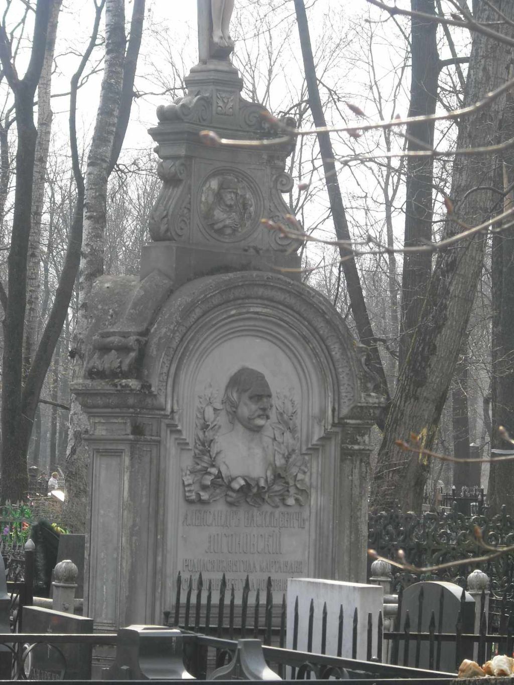 местоположение могилы Александра Васильевича Логановского с надгробным памятником на территории Ваганьковского кладбища (согласно схеме предмета охраны); объемно-пространственная композиция и архитектурно-художественное оформление надгробия второй половины XIX века, представляющего собой трехсторонний двухчастный постамент с профилированными глухими арочками и угловыми пилястрами, декорированными растительным орнаментом (пальметты и другое), и карнизами, с горельефным оплечным портретом А.В.Логановского, обрамленным лавровым венком, перевитым развивающимися лентами, со сложнопрофилированным завершением (Голгофой) с горельефными оплечными фигурами святых и декоративными элементами (волютами, пальметтами) и крестом \"Распятие\" с фигурой Иисуса Христа, включая цоколь, декорированный карнизами, раскрепованный по углам волютами и пальметтами; основание (уточняется в процессе реставрационных исследований) (согласно схеме предмета охраны); шрифтовые композиции на постаменте: \"АЛЕКСАНДРЪ ВАСИЛЬЕВИЧЬ ЛОГОНОВСКiЙ РОДИЛСЯ ВЪ1812 ГОДА МАРТА 12ДНЯ СКОНЛСЯВЪ1855 ГОДА НОЯБРЯ18ДНЯ\", аббревиатура на поверхности титло: `I Н Ц i, в том числе характер их оформления (согласно схеме предмета охраны); материал и техника обработки (мрамор, песчаник, мелкобугристость, лощение, резьба, тонировка).Изменение предмета охраны может быть осуществлено в порядке и случаях, предусмотренных законодательством об объектах культурного наследия.