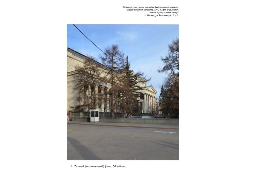 Градостроительные и компонентные характеристики ансамбля:- местоположение, градостроительные характеристики ансамбля, участвующего в формировании застройки улицы Волхонка, Колымажного и М. Знаменского переулков, и его роль в композиционно-планировочной структуре квартала;- объемно-пространственная композиция здания музея и сквера перед главным фасадом, 1912, 1934 гг., включая соотношение открытых и закрытых пространств, застроенных и не застроенных пространств, озелененных и не озелененных участков, формы и породного состава озеленения, габариты и высотные отметки здания и ограды, доминирующее положение здания музея;- планировочная композиция, 1912, 1934 гг., в том числе: сквер с симметрично-периметральной композицией с регулярным типом озеленения и благоустройства, подчиненной центрально-осевой планировке, основные планировочные оси и направления;- композиционное и визуальное взаимодействие элементов ансамбля со стороны открытых городских пространств (улицы Волхонка), ценные видовые раскрытия;- природно-ландшафтные элементы и озеленение после 1934 г., в том числе: рельеф, абсолютные отметки, элементы геопластики (местоположение, породный состав, первоначальный вид и форма, композиционное соотношение газонов, цветников, посадок кустарников и деревьев, формирующее фоновое и аллейное озеленение;- малые архитектурные формы и элементы благоустройства, 1912 г., в том числе: местоположение, конструкция, материал, художественное оформление ограды на гранитном цоколе с металлическими решетками, расположенной по линии ул. Волхонка, Колымажного и М. Знаменского переулков и фиксирующей исторические границы владения; парадной лестницы, оформление цветников и газонов бордюрным камнем.
