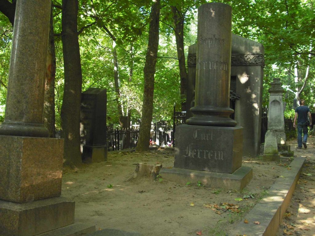 местоположение надгробия конца XIX в. на могиле Феррейн Софии Владимировны (1862–1879 гг.) на семейном захоронении Феррейнов, на участке № 5-1, у южной границы, с западной стороны от надгробия А.К.Феррейна и его жены Л.Феррейн (согласно приложению к настоящему предмету охраны);объемно-пространственная композиция и архитектурно-художественное решение надгробия конца XIX в. на могиле Феррейн Софии Владимировны (1862–1879 гг.), представляющего прямоугольную в плане стелу-часовенку из белого мрамора, состоящую из постамента с профилированными нижним поясом и карнизом, и верхней части с арочными порталами по сторонам, декорированными трехчетвертными угловыми колонками с каннелированными фустами и укрупненными композитными капителями, и фигурным четырехгранным навершием, включая цоколь из шлифованного розового гранита с профилем-скоцией по верхней грани и плиту-основание из песчаника (согласно приложению к настоящему предмету охраны), в том числе габариты и высотные отметки сооружения;конструкция, материал (мрамор, розовый гранит, песчаник), характер (фактура) и виды обработки поверхностей (шлифовка, резьба, гравировка), колористическое решение;шрифтовая композиция на лицевой (северной) стороне надгробия в арке с памятными надписями: \"UNSRE EINZIGE GELIEBTE TOCHTER Sophie Ferrein GEB. D. 7 JANUAR 1862. GEST. D. 6 SEPT. 1879. O WEINE NICHT! JCH BIN DIR NICHT GESTORBEN; EIN EWIG SELIG LEBEN GING MIR AUF. O SAHST DU IHN, DEN KRANZ, DEN ICH ERWORBEN, ES HEMMTE GLEICH SICH DEINER THRANEN LAUF. HIER WOHNT DER FRIEDE, LEUCHTET EWG' ES LICHT. O WEINE NICHT!\", включая технику нанесения (контррельеф), характер шрифта, покрытие (золочение) (согласно приложению к настоящему предмету охраны);шрифтовая композиция на лицевой (северной) стороне цоколя с памятной надписью: \"UNSER GELIEBTES ALTESTES GROSSKIND СОНЯ GEB. D. 9 OCT. 1890. GEST. D. 10 JAN. 1905 DIE LIEBE HÖRET NIMMER AUF.\", включая технику нанесения (контррельеф), характер шрифта, покрытие (золочение) (согласно приложению к настоящему предмету охраны).Изменение предмета охраны может быть осуществлено в порядке и случаях, предусмотренных законодательством об объектах культурного наследия.