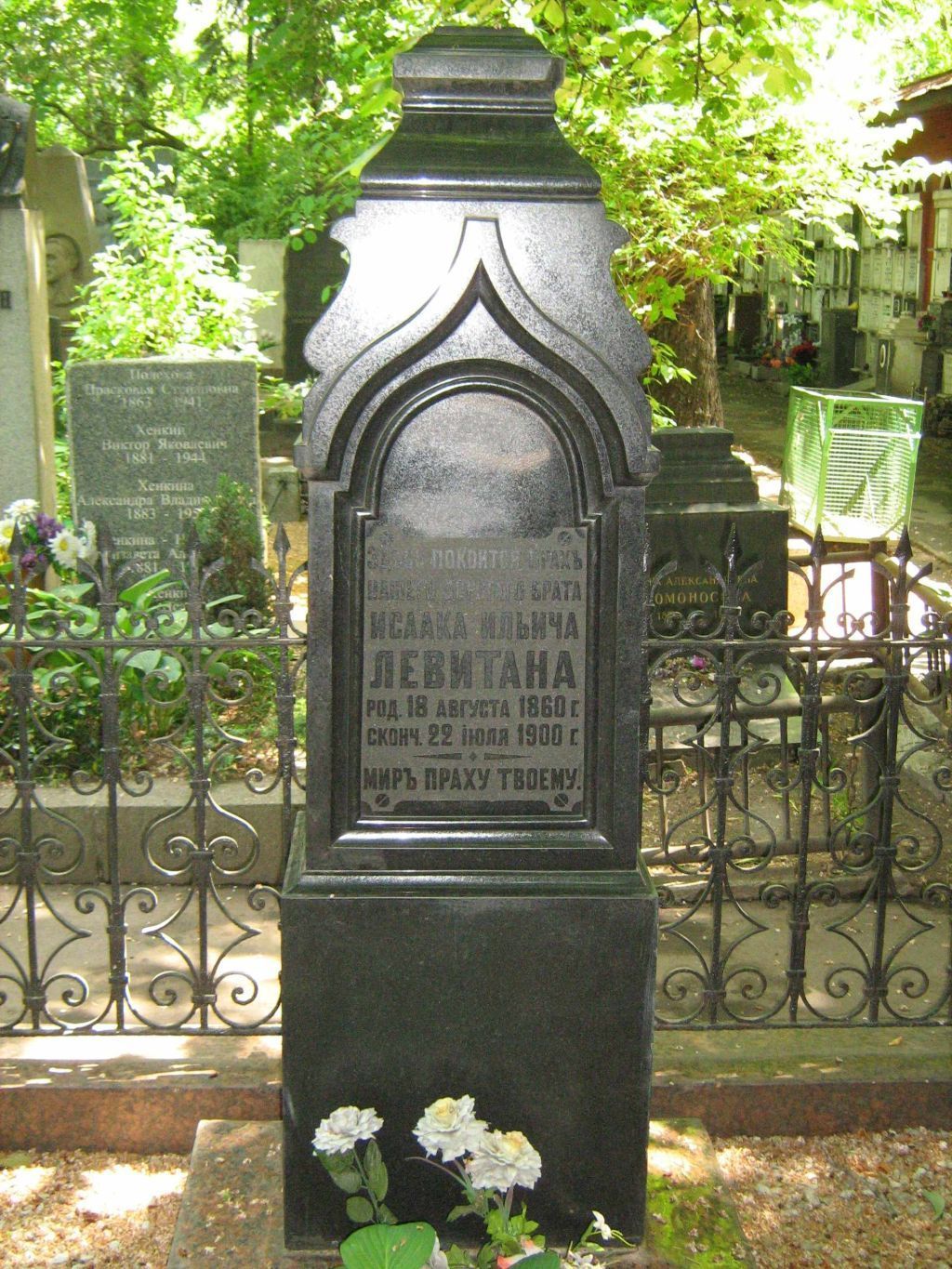 местоположение могилы с надгробием 1902 года, ее роль в композиционно-планировочной структуре Новодевичьего кладбища (участок № 2) (согласно схеме предмета охраны);объемно-пространственная композиция и архитектурно-художественное решение надгробия 1902 года, включающие стелу-часовню с фигурным завершением, постамент, плиту основания, бордюр, их габариты и высотные отметки (согласно схеме предмета охраны);конструкция, материал (полированный габбро, серо-розовый гранит), характер и виды обработки поверхностей (полировка, шлифовка, гравировка) надгробия 1902 года;шрифтовая композиция в арочной нише на лицевой стороне надгробия со словами: \"ЗДѣСЬ ПОКОИТСЯ ПРАХЪ НАШЕГО ДОРОГАГО БРАТА ИСААКА ИЛЬИЧА ЛЕВИТАНА РОД. 18 Августа 1860 г. сконч. 22 iюля 1900 г. МИРЪ ПРАХУ ТВОЕМУ!\", включая технику нанесения, характер шрифта, колористическое решение (согласно схеме предмета охраны);шрифтовая композиция в арочной нише на тыльной стороне надгробия с памятной надписью на иврите, включая технику нанесения, характер шрифта, колористическое решение (согласно схеме предмета охраны). Изменение предмета охраны может быть осуществлено в порядкеи случаях, предусмотренных законодательством об объектах культурного наследия.