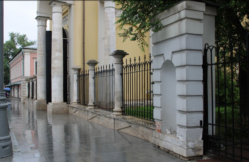 местоположение и градостроительные характеристики ограды с пилонами, участвующей в формировании застройки улицы Большой Полянки, ее роль в композиционно-планировочной структуре ансамбля и квартала (согласно схеме предмета охраны); ограда с пилонами конца XVIII−XIX веков, ее материал, конструкция, высотные отметки, композиционное и колористическое решение, декоративное оформление, включая белокаменный цоколь с филенками, белокаменные колоны со ступенчатыми навершиями и постаментами, рустованные пилоны с арочными нишами, металлические решетки ограды и створки ворот (уточняется в процессе реставрационных исследований).Изменение предмета охраны может быть осуществлено в порядке и случаях, предусмотренных законодательством об объектах культурного наследия.