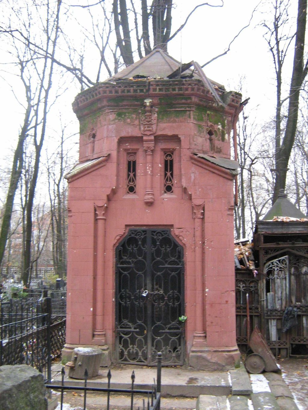 местоположение сооружения 2-й половины XIX века на территории Введенского кладбища (согласно схеме предмета охраны);объемно-пространственная композиция сооружения 2-й половины XIX века, включающего объем часовни (восьмерик на четверике) с апсидой и металлической пристройкой (сенями), в том числе площадку, мощенную камнем, металлическую ограду на каменном цоколе, высотные отметки по венчающим карнизам (уточняется в процессе реставрационных исследований) (согласно схеме предмета охраны);крыши на 2-ю половину XIX века, их конструкция, конфигурация, материал, характер кровельного покрытия, конструкция водостока, высотные отметки по крестам (уточняется в процессе реставрационных исследований);композиционное решение и архитектурно-художественное оформление фасадов сооружения 2-й половины XIX века, в том числе местоположение, форма, размер, оформление оконных и дверных проемов, профилированный цоколь часовни, ниша с парными колонками с резными капителями и базами, рельеф с изображением дворянского герба А.И.Овера, профилированный карниз, блоки основания сени, декоративные решетки сени с остеклением (уточняется в процессе реставрационных исследований) (согласно схеме предмета охраны);материал и характер отделки фасадных поверхностей 2-й половины XIX века, в том числе известняк шлифованный, мелкобугристый, песчаник мелкобугристый, кирпич, штукатурка, кованая и листовая сталь, окраска, стекло, витражное стекло, бронза, литье, патина (уточняется в процессе реставрационных исследований);колористическое решение фасадов 2-й половины XIX века, включая цоколь (уточняется в процессе реставрационных исследований);пространственно-планировочная структура сооружения 2-й половины XIX века в пределах капитальных стен и перекрытий (согласно схеме предмета охраны);капитальные стены и перекрытия 2-й половины XIX века, включая своды часовни и склепа, их конструкцию и материал, местоположение погребальных ячеек с тремя надгробными плитами (согласно схеме предмета охраны); одномаршевая лестница 2-й половины XIX века, ее декоративное оформление, местоположение и материал (согласно схеме предмета охраны);архитектурно-художественное оформление интерьеров сооружения 2-й половины XIX века, в том числе характер и материал мощения пола, характер отделки стен, росписи стен и свода, местоположение каналов системы естественной вентиляции, в том числе местоположение продухов, вентиляционных отверстий с решетками (уточняется в процессе реставрационных исследований);заполнения оконных и дверных проемов на 2-ю половину XIX века, их материал, характер оформления, рисунок расстекловки, колористическое решение, включая скобяные приборы (уточняется в процессе реставрационных исследований);шрифтовые композиции 2-й половины XIX века: над входом в часовню прорезными буквами эпитафия на латинском языке: \"REQVIESCANT IN PACE.\", на мемориальной плите Н.О.Овер прорезными буквами в две строки на французском языке: \"NATHALiE AUVERT\", \"NÉE SiCHLER\", на мемориальной плите А.И.Овер прорезными буквами в три строки на французском языке: \"ALEXANDRE AUVERT\", \"NÉ LE 18 SEPTEMBRE 1804\", \"DECÉDÉ LE 23 DÉCEMBRE 1864\", эпитафия на французском языке: \"NOTRE ANGE BiEN – AiMÉ PRiEZ POUR NOUS.\", посвящение на французском языке в три строки: \"VOTRE FEMME, VOTRE FiLLE\", \"ANNA AUVERT.\", \"VERA AUVERT.\", на малой плите с рельефным четырехконечным крестом и двумя декоративными кольцами по у