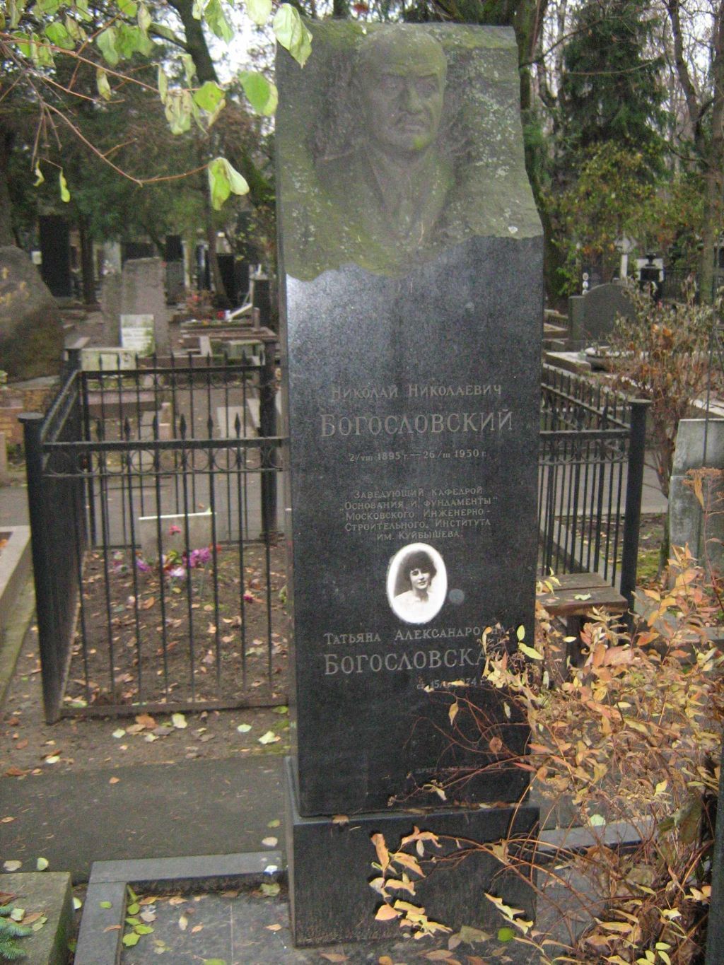 местоположение (участок 2, ряд 25, место 7) и габариты надгробия 1950 года в общей структуре Новодевичьего кладбища;объемно-пространственная композиция надгробия 1950 года;архитектурно-художественное решение надгробия: стела в форме вертикально стоящего параллелепипеда со скульптурным портретом Н.Н.Богословского, основание кубической формы;мемориальные и посвятительские надписи, автограф скульптора Токарева;плиты-мощения на бетонном основании с цветником;бордюрное ограждение, расположенное по периметру кладбищенского участка, состоящее из горизонтальных блоков с пониженным блоком-ступенью;материал и техника отделки надгробия: гранит, полировка, шлифовка, резьба, обработка \"под скалу\", обработка \"под шубу\", золочение.Изменение предмета охраны может быть осуществлено в порядке и случаях, предусмотренных законодательством об объектах культурного наследия.