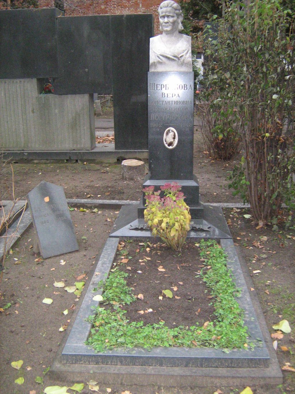местоположение надгробия на могиле 1948 года, на \"старой\" территории Новодевичьего кладбища, участок 1, ряд 42 (согласно приложению к настоящему предмету охраны);объемно-пространственная композиция и архитектурно-художественное оформление надгробия 1948 года на могиле В.К.Щербаковой, включая скульптурный портрет из белого мрамора, квадратный в плане постамент из черного габбро, со ступенчатым цоколем с фаской в месте соединения с основной частью, памятной надписью и овальным керамическим медальоном с цветным фотопортретом на лицевой стороне, плиту-основание того же материала, что и постамент, со скатной поверхностью, и установленную на нем бронзовую литую композицию с венком из роз и уложенными складками лентами, а также габариты и высотные отметки сооружения, в том числе: прямоугольный цветник, скамейку на фигурных опорах и невысокий борт из прямоугольных брусков, выполненные из шлифованного черного габбро (согласно приложению к настоящему предмету охраны);конструкция, материал (белый мрамор, габбро, керамика, бронза), характер и виды обработки (фактура) поверхностей (резьба, полировка, тонкая шлифовка, литье, гравировка);шрифтовая композиция на лицевой стороне постамента с памятной надписью: \"ЩЕРБАКОВА ВЕРА КОНСТАНТИНОВНА УРОЖДЕННАЯ \"ПЕСТРОУХОВА\" 1902 6-V. – 1948 9-VI.\", включая технику нанесения (контррельеф), характер и покрытие (золочение) шрифта, колористическое решение (согласно приложению к настоящему предмету охраны). Изменение предмета охраны может быть осуществлено в порядке и случаях, предусмотренных законодательством об объектах культурного наследия.