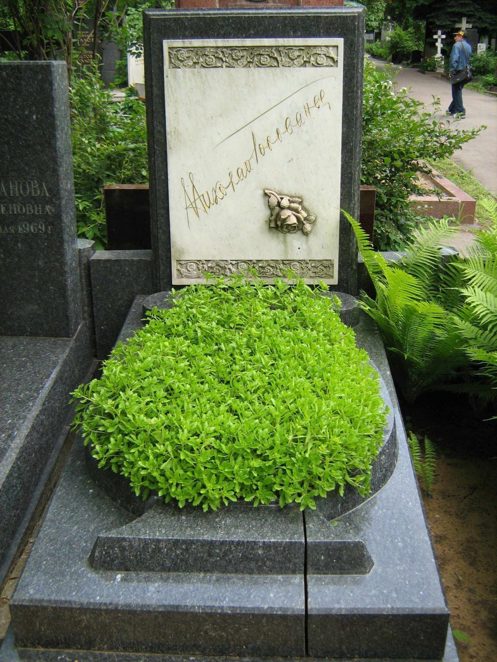 местоположение могилы с надгробным памятником середины 1950-х годов, расположенной на участке № 3, ряд № 22, захоронение № 1, их роль в композиционно-планировочной структуре Новодевичьего кладбища (согласно схеме предмета охраны);объемно-пространственная композиция и архитектурно-художественное оформление надгробного памятника середины 1950-х годов, включая стелу с профилированными краями и плитой, оформленную декоративным резным орнаментом в верхней и нижней частях, шрифтовой композицией по диагонали и барельефным изображением розы с оторвавшимся лепестком, включая цветочницу в виде лиры у подножия и общий двухступенчатый постамент, включая ограду на цоколе с калиткой, восьмигранными столбиками и литыми ажурными решетками, оформленными растительными мотивами, с розетками и подвешенными к столбикам лавровыми гирляндами, перевитыми лентой (согласно схеме предмета охраны), в том числе габариты и высотные отметки;конструкция, материал (лабрадорит, мрамор, бронза), характер и виды обработки поверхностей (полировка, шлифовка, резьба, гравировка), колористическое решение надгробного памятника 1950-х годов; рельефная шрифтовая композиция \"НИКОЛАЙ ГОЛОВАНОВ\", ее местоположение, характер шрифта, способ нанесения (контррельеф), колористическое решение (золочение) (согласно схеме предмета охраны). Изменение предмета охраны может быть осуществлено в порядке и случаях, предусмотренных законодательством об объектах культурного наследия.