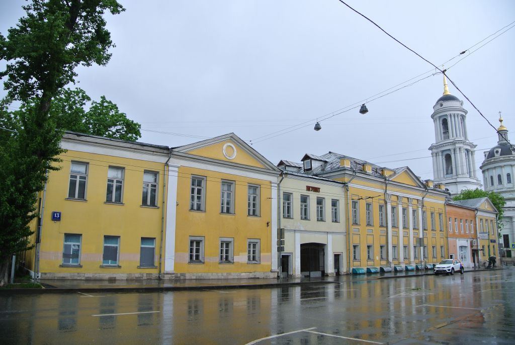 1. Ансамбль:местоположение и градостроительные характеристики ансамбля конца XVIII-XIX веков, участвующего в формировании фронта застройки улиц Александра Солженицына и Станиславского, его роль в композиционно-планировочной структуре квартала (согласно схеме предмета охраны);объемно-пространственная композиция ансамбля конца XVIII-XIX веков, включая габариты, высотные и силуэтные характеристики зданий и сооружений;пространственно-планировочная структура ансамбля конца XVIII-XIX веков, включая соотношение застроенных и незастроенных пространств, местоположение зданий, характер озеленения;местоположение утраченной ограды XVIII века (согласно схеме предмета охраны).2. \"Главный дом\" (г. Москва, ул. Александра Солженицына, д. 13, стр. 1 (часть):местоположение и градостроительные характеристики здания конца XVIII-XIX веков, участвующего в формировании фронта застройки улицы Александра Солженицына, его роль в композиционно-планировочной структуре ансамбля усадьбы и квартала (согласно схеме предмета охраны);объемно-пространственная композиция двухэтажного с подвалом и антресолями здания, включающего прямоугольный в плане объем с проездными арками 1844 года, в том числе высотные отметки по венчающему карнизу, фронтону и парапетным столбам ограждения крыши (согласно схеме предмета охраны);крыша XIX века, ее конфигурация, характер кровельного покрытия, высотные отметки по конькам;композиционное решение и архитектурно-художественное оформление фасадов конца XVIII-XIX веков, включая местоположение, размер, форму, оформление оконных и дверных проемов, в том числе белокаменный цоколь, пилястровый портик коринфского ордера, завершенный крепованным антаблементом и фронтоном, ниши оконных проемов с прямоугольными и квадратными филенками, подоконные доски, пилястры, профилированные междуэтажные карнизы, венчающий карниз с широким гладким фризом, парапетные столбики ограждения крыши и аттик за фронтоном (с учетом реставрационных работ начала 2000-х годов) (согласно схеме предмета охраны);материал и характер отделки фасадных поверхностей конца XVIII-XIX веков: белокаменная облицовка цоколя, гладкая штукатурка с окраской;колористическое решение фасадов конца XVIII-XIX веков (уточняется по результатам реставрационных исследований и раскрытий);пространственно-планировочная структура интерьеров здания в пределах капитальных стен, прямоугольных и арочных проемов, пилонов, колонн, перегородок и перекрытий конца XVIII-XIX веков (согласно схеме предмета охраны);капитальные стены, пилоны, колонны, перегородки и перекрытия конца XVIII-XIX веков, их конструкции и материал, включая сводчатые перекрытия с распалубками в уровне подвала, первого и второго этажей (согласно схеме предмета охраны);лестницы конца XVIII-XIX веков, их местоположение, конструкция, материал, декоративное оформление (согласно схеме предмета охраны);архитектурно-художественное оформление интерьеров XIX века, включая альков с двумя колоннами коринфского ордера, перекрытый коробовой аркой и антаблементом, декорированными лепниной, профилированные и лепные с орнаментальными фризами карнизы потолков, розетки, в том числе с живописным плафоном, лепной декор потолков, пояса кессонов, заполненные орнаментальной лепниной, лопатки, балюстрада оркестрового балкона, паркет (уточняется и дополняется по резуль