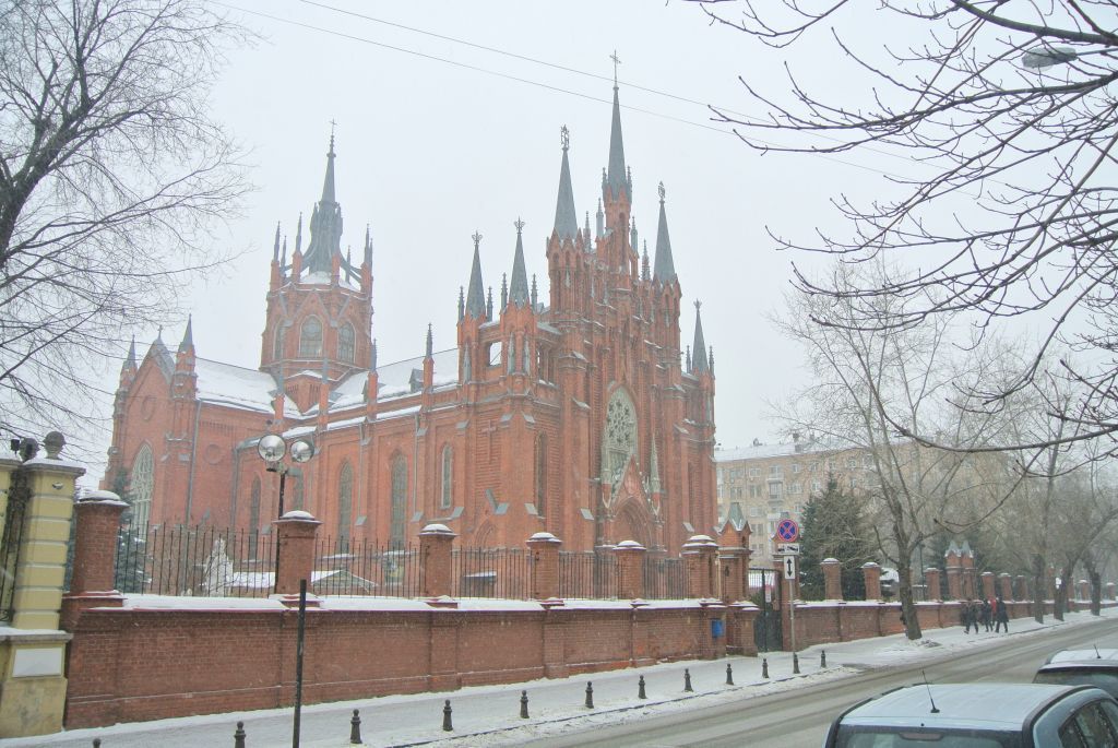 1. Собор (строение 1):местоположение и градостроительные характеристики здания собора 1910–1911 годов, участвующего в формировании застройки улиц Малой Грузинской и Климашкина, его роль в композиционно-планировочной структуре квартала;объемно-пространственная композиция здания собора 1910–1911 годов в форме латинского креста в плане, базиликального типа, состоящая из трех нефов, поперечного трансепта с куполом в средокрестии, просвитерия с ризницей (сакристией) и алтарем, паперти с тремя межуровневыми лестницами, крипты, притвора и встроенной звонницы с восточной стороны, в том числе высотные отметки по венчающим карнизам, парапетам, аркадам, щипцовым фронтонам (вимпергам), пинаклям, башням и их завершениям (с учетом реставрации 1990-х годов);крыши, шатры, шпили, аркбутаны 1910–1911 годов, их конструкция, конфигурация, характер кровельного покрытия, в том числе высотные отметки, включая слуховые окна (с учетом реставрации 1990-х годов);композиционное решение и архитектурно-художественное оформление фасадов здания собора 1910–1911 годов, включая размер, форму, местоположение, оформление оконных и дверных проемов, в том числе цоколь, перспективный портал главного входа с архивольтами, вимпергом, фланкированный пилонами-контрфорсами с пинаклями, фиалами и крестоцветом, готическая роза второго яруса с каменным восьмилепестковым переплетом, ступенчатые контрфорсы с гранеными башенками с шатрами, горизонтальные кирпичные пояса, лопатки, стрельчатые высокие ниши, ажурные колоннады башен со стрельчатыми проемами с вимпергами, в том числе оформление встроенной звонницы с открытым третьим ярусом звона и восьмигранной башни над средокрестием, с фигурной пирамидальной башенкой-шатром с крестом, декоративными конструкциями аркбутанов с пинаклями и фиалами (с учетом реставрации 1990-х годов);материал и характер отделки фасадных поверхностей 1910–1911 годов;колористическое решение фасадов 1910–1911 годов;пространственно-планировочная структура интерьеров здания собора в пределах капитальных стен, опорных столбов, пилонов, прямоугольных и арочных проемов, в том числе система сводчатых перекрытий 1910–1911 годов, стрельчатые аркады (с учетом реставрации 1990-х годов);капитальные стены, опорные столбы, пилоны и сводчатые перекрытия 1910–1911 годов, их конструкции и материал (с учетом реставрации 1990-х годов);лестницы 1910–1911 годов, их местоположение (с учетом реставрации 1990-х годов);архитектурно-художественное оформление интерьеров 1910–1911 годов, в том числе кессонированный потолок притвора, тяги, колонны, парапетные ограждения хор со сквозным орнаментом, портальное оформление стрельчатых проемов и ниш, лепной декор на парусах и в основании купола (с учетом реставрации 1990-х годов);колористическое решение интерьеров 1910–1911 годов;материал и характер оформления столярных заполнений оконных и дверных проемов, витражей 1910–1911 годов (с учетом реставрации 1990-х годов).2. Ограда, 1903 г., арх. Даукша Л.Ф.:местоположение и градостроительные характеристики ограды с воротами, участвующей в формировании застройки улиц Малой Грузинской и Климашкина, их местоположение, конструкция, материал, характер отделки, колористическое решение, габариты, архитектурно-художественное решение, включая пилоны ворот с пирамидальными завершениями, сквозными нишками (с учетом реставрации 1990-