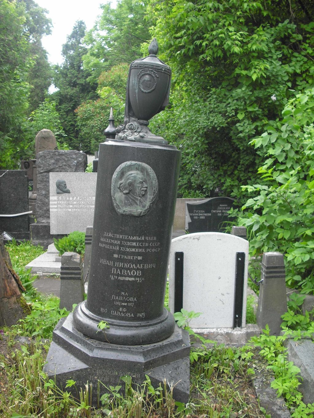 местоположение могилы художника И.Н.Павлова с надгробием конца 1930–1950-х годов, их роль в композиционно-планировочной структуре Новодевичьего кладбища (согласно схеме предмета охраны);объемно-пространственная композиция и архитектурно-художественное решение надгробия И.Н.Павлова конца 1930–1950-х годов, включая прямоугольный со срезанными наклонно углами и восьмигранным верхом постамент, установленную на нем колонну с базой, навершием в виде урны и накладным барельефом на лицевой стороне (согласно схеме предмета охраны), его габариты и высотные отметки;урна со светильником, накрытая драпировкой с розами у основания, и рельефным портретом жены художника в медальоне из лаврового венка, накладной барельеф в виде лаврового венка в форме овала, с профильным портретом художника в центре и изображением доски и инструмента гравера на переднем плане, включая их местоположение, материал (бронза), технику исполнения (литье), колористическое решение конца 1930–1950-х годов (согласно схеме предмета охраны), в том числе подпись автора на плинте урны \"Ск. ТАЕЖНЫЕ\";мемориальные посвятительные надписи: на лицевой стороне колонны \"ДЕЙСТВИТЕЛЬНЫЙ ЧЛЕН АКАДЕМИИ ХУДОЖЕСТВ СССР НАРОДНЫЙ ХУДОЖНИК РСФСР ГРАВЕР ИВАН НИКОЛАЕВИЧ ПАВЛОВ 1872 1951\", в нижней части колонны \"М.А ПАВЛОВА 1868 1937\", \"Е.Ф 1893 ПАВЛОВА 1978\", на лицевой стороне цоколя: \"СВЕТЛОЙ ПАМЯТИ МИЛОЙ И ДОРОГОЙ 43 ЛЕТНЕЙ СПУТНИЦЕ ЖИЗНИ ЛЮБЯЩИЙ МУЖ ИВАН ПАВЛОВ. ЗАСЛУЖЕННЫЙ ДЕЯТЕЛЬ ИСКУССТВ\", включая их местоположение, характер оформления (техника врезки надписей и изображения, характер шрифта), включая гравированное изображение лавровой ветки между датами (согласно схеме предмета охраны);конструкция, материал постамента и колонны (гранит), характер обработки (полировка, гравировка), колористическое решение конца 1930–1950-х годов;ограждение участка, состоящее из каменных блоков, его габариты и высотные отметки.Изменение предмета охраны может быть осуществлено в порядке и случаях, предусмотренных законодательством об объектах культурного наследия.