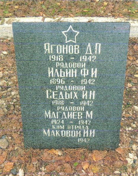 - захоронение и его местоположение;- останки усопших;- текст мемориальной надписи: «ЯГОНОВ Д.П.1918-1942РЯДОВОЙИЛЬИН Ф.И.1896-1942РЯДОВОЙСЕДЫХ И.Н.1918-1942РЯДОВОЙМАГДИЕВ М.1924-1942КОМ. ОТРЯДАМАКОВОЙ И.И.1942»