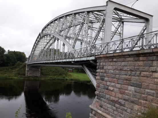 Местоположение и градостроительные характеристики однопролетного металлического арочного моста в створе улиц Кропоткина и проспекта Гагарина.Объемно-пространственная композиция одноппролетного металлического арочного моста на двух береговых устоях (техническая характеристика сооружения):- полная длина (между задними гранями устоев) - 129,18 м;- пролётное строение трехшарнирная арка - lр = 107,810 м; f= 19,0 м; f /l=1/5(где lр - расчётный пролёт; f- стрела арок);- отверстие моста - 107,00 м.- габарит проезжей части (фактический) - длина – 109,6 м, ширина - 6,00 м + 2 тратуара шириной 1,75 м.Конструктивное решение и архитектурно-художественное оформление моста:- оригинальность конструкции моста, выполненной по принципу напряженного лука;-отверстие моста перекрытое одним арочным (трехшарнирная арка) металлическим сквозным пролетным строением с ездой посередине;- пролетное строение состоящее из двух арок, объединенных по длине верхними (в плоскости верхних поясов арок) и нижними ветровыми связями крестовой решети и балочной клеткой проезжей части, а также поперечными связями в плоскости стоек. Расстояние между арками в осях 7,38 м. Стрела подъема арки 19 м. Каждая арка состоит из двух клепаных поясов П-Н образного сечения. Оба пояса арок соединены между собой стойками и раскосами и представляют собой ферму. Все соединения пролетного строения выполнены на заклепках. Оба пояса сходятся в середине пролета в шарнире, образуя по статической схеме работы трехшарнирную арку. Нижний пояс арок опирается на опоры через опорные части балансирного типа;- балочная клетка представляющая собой систему продольных и поперечных клепаных балок. Поперечные балки высотой 90 см установлены с шагом 5,63 м и прикреплены к подвескам на заклепках с помощью уголков, продольные - аналогично к поперечным. В поперечном сечении пролетного строения имеется пять продольных балок, из них три средней высотой 60 см и две крайних высотой 36 см;- конструкция проезжей части представляющая собой металлический ортотропный настил. Блоки настила объединены по длине в три неразрезанные плети и имеют 4 деформационных шва. Швы расположены в сопряжениях с опорами (устоями) и в местах пересечения проезжей части с нижними поясами арок. Тротуары перекрыты ортотропной плитой, ребра жесткости которой ориентированы поперек моста и опираются на тротуарные прогоны;- опорная рама образующая въездной портал пролетного строения;- перильные ограждения металлические высотой 115 см с частотой шага несущих конструкций ограждения 2,1 м: в виде сдвоенных секций, выполненных из тонких металлических полос с закруглением на концах, закрепленных на диагональные направляющие и образующие геометрические фигуры в форме квадратов. В центре диагонального перекрестия – металлическая декоративная розетка в виде четырехлистника. Металлические перила – швеллер в поперечном сечении;- устои моста массивные, бутобетонные, облицованные фактурными гранитными блоками прямоугольной формы и декорированные по периметру профильными гранитными карнизом и тягой в верхней и центральной части соответственно. Левобережный устой опирается на свайное основание. Сваи деревянные диаметром 28...30 см длиной 6,5 м. Правобережный устой на кессонном основании;- откосы конусов устоев укрепленные двойным каменным мощением на слое каменного хряща