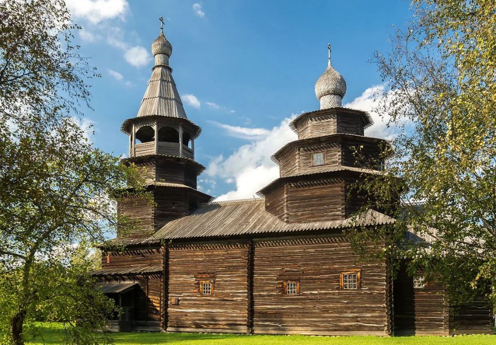 Расположение здания. Композиционная роль в структуре музея народного деревянного зодчества «Витославлицы». Местоположение по Генеральному плану музея народного деревянного зодчества «Витославлицы». Находится в центральной части музея и располагается в формируемом архитектурном комплексе «Погост».Здание в целом: материал – дерево (сосна, ель, осина), признанный пригодным для эксплуатации, в том числе, приобретенный в результате достоверной реставрации. Конфигурация плана здания по внешнему контуру. В основе храма -прямоугольный в плане сруб, разделенный поперечной стеной на собственно церковь (молельное помещение) и трапезную (притвор). С востока к церкви примыкает пятигранный алтарный прируб, а с запада – квадратная паперть с трехсторонней каркасной галереей и крыльцами. Все части функционально и конструктивно связаны между собой. Габариты и объемно-конструктивное решение церкви, состоящей из разновеликих и разновысоких частей. Здание относится к ярусным постройкам, а также к храмам, построенным «кораблём», когда все части расположены на одной оси, а церковь и колокольня имеют высокие завершения. Над четвериком церкви расположено три восьмерика, постепенно уменьшающихся в размерах и завершающихся главкой. Над папертью возвышаются трех ярусная колокольня, состоящая из двух рубленых восьмериков и каркасного яруса звона, который завешается высоким шатром с главкой. Каждый восьмериковый ярус церкви и колокольни покрыт на восемь скатов. Двухскатная крыша трапезной объединена с крышей четверика, а конек её крыши находится на уровне крыши нижнего восьмерика церкви. Крыша алтаря ниже и имеет пять скатов, галереи имеют односкатные крыши, которые «обходят» паперть с трех сторон, крыши крылец односкатные. Ярус звона колокольни защищен от проникновения влаги пологой восьмискатной крышей верхнего восьмерика. В интерьере стены протесаны до углов на высоту от пола до перекрытия. Почти все внутреннее убранство - скамьи, клиросы, престол, столик, полочка - реставрированы по сохранившимся врубкам. Первоначальные «косящатые» окна, состоящие из 3-х колод, сохранились во втором восьмерике церкви. Остальные окна были растесаны, но по наружным подтескам бревен удалось восстановить их размеры и реставрировать. В интерьере сохранился четырех ярусный иконостас, который был создан вскоре после строительства церкви местными (или вологодскими) мастерами в стиле барокко. Характер резьбы достаточно простой, по конструкции иконостас каркасно-рамочный, крайние части нижнего яруса заходят на боковые стены. Формы, уклоны, типы крыш и кровель. Все кровли на храме «тесовые» - из двух слоев дороженных досок. Концы верхнего «красного» слоя традиционно обработаны в форме «зубцов». Верх кровель – «конек» - закрыт охлупнем, на котором крепится декоративная резная доска - гребень. Под шатром колокольни расположена особая кровля – «полица», которая предназначается для эффективного отвода воды. Шейки и главы на церкви и на колокольне оббиты «лемехом» – осиновыми тесаными дощечками с обработкой нижних частей в виде «городка». Шейку главы колокольни опоясывает веер остроконечного лемеха – т.н. «юбка», а под главами расположены веера - «воротнички» из более мелкого лемеха. Архитектурное решение фасадов. Расположение, количество, характер дверн