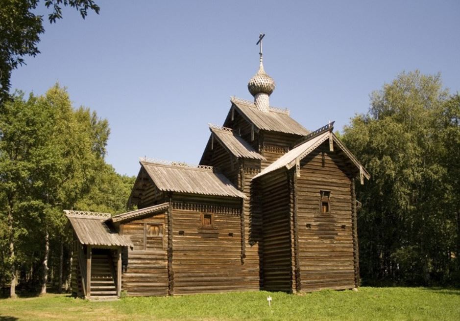 Расположение здания. Композиционная роль в структуре музея народного деревянного зодчества «Витославлицы». Местоположение по Генеральному плану музея народного деревянного зодчества «Витославлицы». Находится в юго-восточной части музея и располагается вне формируемых архитектурно-этнографических секторов.Здание в целом: материал – дерево (сосна, ель, осина), признанный пригодным для эксплуатации, в том числе, приобретенный в результате достоверной реставрации.Конфигурация плана здания по внешнему контуру. Здание относится к т. н. «крещатым» храмам, у которых план выполнен в виде «креста». Ветви «креста» включают: с востока пятистенный алтарь, с севера и юга – прямоугольные прирубы, с запада – небольшой прируб (выступ), который переходит в сруб трапезной. К трапезной с запада и севера примыкают срубные части, над которыми расположены каркасные паперть и галерея. Все части функционально и конструктивно связаны между собой. Конфигурация плана по внешнему контуру одновсходного крыльца, которое расположено с западной стороны паперти. Габариты и объемно-конструктивное решение церкви, состоящей из разновеликих и разновысоких частей. Имеет высокое подцерковье. По объемно-конструктивным признакам относится к типу ярусных храмов. Ярусность создает четверик, надрубленный над «крестом» с небольшим смещением к западу, что придает композиции церкви асимметричность. Формы, уклоны, типы крыш и кровель. Все срубы, а также крыльцо, покрыты двухскатными крышами, алтарь покрыт на пять скатов. Паперть и галерея имеют односкатные крыши. Архитектурное решение фасадов. Расположение, количество, характер дверных и оконных проемов. Южные стены южного прируба и трапезной имеют традиционную композицию из трех оконных проемов – одного косящатого и двух волоковых. Декоративное убранство фасадов и интерьеров. Конструктивные и типологические особенности срубов, каркасных конструкций, элементов и узлов, обработка поверхности древесины.Фундаменты. Система фундаментов - столбчатые буто-бетонные под углами срубов и под перерубами стен. В промежутках между ними - ленточная «забирка» из валунов, изоляция из бересты. Конструкция, расположение, материал, характер.Стены. Рубленые стены из круглых бревен; бревен, протесанных с внутренней стороны до углов (в пределах эксплуатационного этажа. Конструкция, расположение, параметры, характер обработки поверхности. Повалы в верхних частях срубов. Конструкция, расположение, параметры, характер обработки поверхности. Угловые соединения срубов «в обло». Характер обработки, размеры. Угловые соединения срубов «в лапу» (алтарь, рундук крыльца, углы сруба под папертью и галереей, внутренние углы «креста»). Характер обработки, размеры. Припазовка бревен между собой по длине. Характер обработки, размеры. Подтески на бревнах к дверным и оконным косякам (колодам). Характер обработки, размеры. Следы на бревнах - гнезда, пазы, протески и пр. - от прежде существовавших конструкций и форм. Расположение, характер обработки поверхности, размеры.Крыши. Самцово-слеговая конструкция крыш срубов. Стропильно-слеговая конструкция крыш алтаря, паперти, галереи, крыльца. Конструктивная схема, расположение, углы наклона скатов, соединение элементов, характер обработки. Кровли. Тип кровли (тесовый с резными зубцами), конструкци