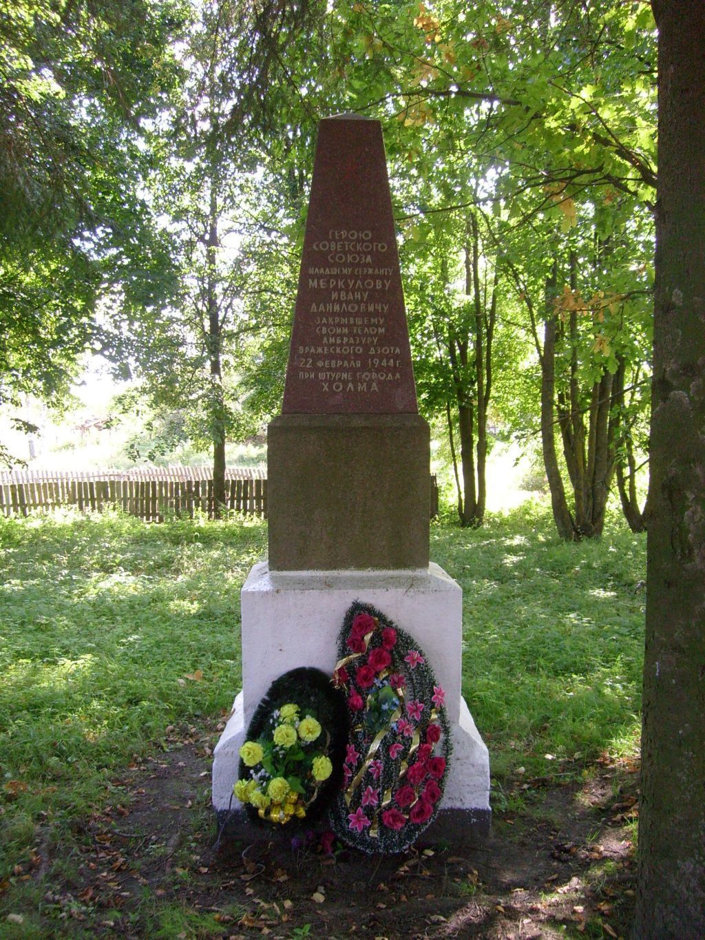 Памятник Герою Советского Союза сержанту Меркулову Ивану Даниловичу (на месте гибели), наводчику станкового пулемета 312 стрелкового полка, 26 стрелковой дивизии, закрывшему своим телом вражеский дзот 22 февраля 1944 года в бою за г. Холм