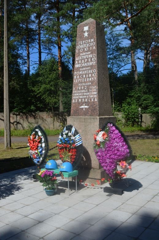 - захоронение и его местоположение;- останки усопших;- конструктивное и архитектурно-художественное решение гранитный обелиск с надписью: \"Героям Советского Союза капитану Дехтяренко Андрею Николаевичу капитану Романенко Василию Сергеевичу погибшим в 1942 году в воздушных боях с немецко-фашистскими захватчиками в районе Демянка\" и мемориальная плита на могиле Романенко В.С. с изображением штурмовика ИЛ-2, портрета героя и изображениями орденов: \"Звезда Героя\", \"Орден Ленина\", \"Орден Боевого Красного Знамени\" и надписью: \"Герой Советского Союза командир эскадрильи 502 штурмового авиаполка капитан Романенко Василий Сергеевич 29.04.1909-30.06.1942, захоронен 06.08.2015\".- мемориальная надпись на гранитном обелиске:\"Героям Советского Союза капитану Дехтяренко Андрею Николаевичу капитану Романенко Василию Сергеевичу погибшим в 1942 году в воздушных боях с немецко-фашистскими захватчиками в районе Демянска\";- мемориальная надпись на гранитной плите:\"Герой Советского Союза командир эскадрильи 502 штурмового авиаполка капитан Романенко Василий Сергеевич 29.04.1909-30.06.1942. захоронен 06.08.2015\".