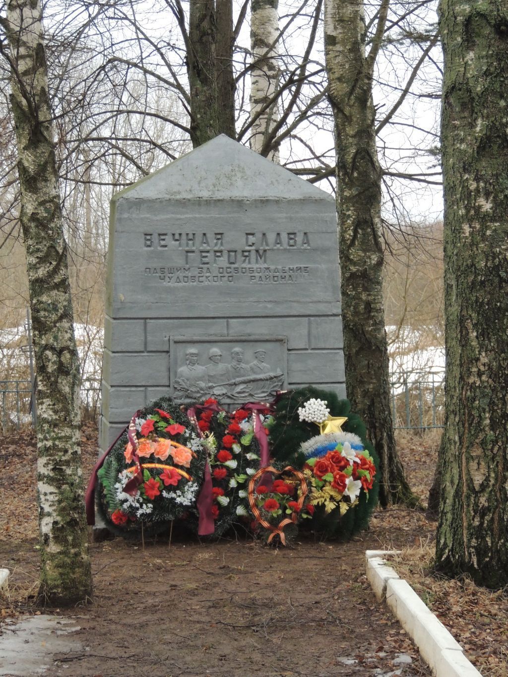 - захоронение и его местоположение;- останки усопших;- конструктивное, архитектурно-художественное решение бетонного обелиска;- текст мемориальной надписи на бетонном обелиске:\"ВЕЧНАЯ СЛАВА ГЕРОЯМ павшим за освобождение Чудовского района\";- барельеф, выполненный на металлической плите, изображающий четырех воинов, представителей четырех родов войск Советской Армии: летчика, пехотинца, танкиста, матроса;- текст на мемориальных плитах. Фамилии захороненных бойцов;- текст на мемориальной плите: \"Они погибли за нашу Советскую Родину. 1941-1945\";- текст на мемориальной плите: \"ВЕЧНАЯ ИМ СЛАВА\";- мемориальный текст на индивидуальных захоронениях. Фамилии захороненных бойцов.