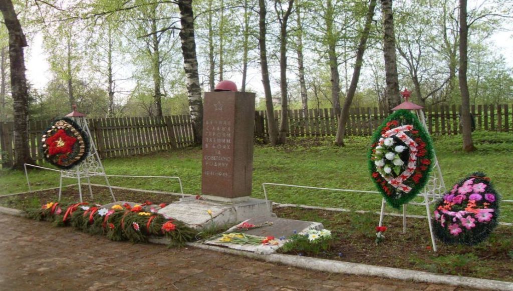 - захоронение и его местоположение;- останки погибших;- конструктивное, архитектурно-художественное решение гранитной стелы с прямоугольным завершением;- на лицевой стороне стелы пятиконечная звезда и текст: \"Вечная слава героям, павшим в боях за Советскую Родину 1941-1945\";- по обе стороны стелы на бетонном постаменте гранитные плиты с фамилиями захороненных воинов, датой рождения и гибели.