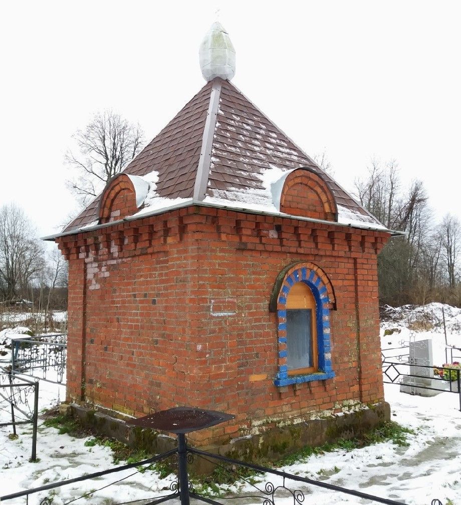 Объемно-пространственное и планировочное решение территории: местоположение здания часовни на Угловском сельском кладбище (территория з/у №13П) у главных ворот; роль местной доминанты прилегающего ландшафта. Объемно-пространственное решение: габариты и конфигурация здания часовни –квадратная в плане, одноэтажная;историческая конфигурация крыши здания часовни (тип – четырехскатная);Конструктивная система: Фундамент валунный; исторические наружные кирпичные стены здания; низкий цоколь из кирпича.Объемно-планировочное решение: историческое объемно-планировочное решение в габаритах капитальных стен часовни: высота здания до карниза; исторический угол наклона четырехскатной кровли часовни.Архитектурно-художественное решение фасадов: архитектурно-художественное решение фасадов часовни в «кирпичном» стиле: материал и характер отделки фасадов – кирпич; местоположение, габариты, конфигурация исторических дверных и оконных проемов: полуциркульные фронтоны (четыре), по габаритам соответствующие ширине ниже расположенных проемов; оконные проемы боковых фасадовпрямоугольной формы с полуциркульным завершением, с обрамлением из наличников простой формы; завершение в виде луковицы вытянутой формы и креста; дверной проем прямоугольной формы сарочным завершением; конфигурация стен с угловыми лопатками. карниз с широким кронштейном простой формы.
