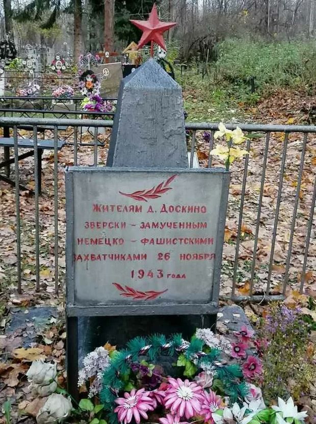 - захоронение и его местоположение в структуре кладбища;останки усопших;текст на мемориальной доске: \"Жителям д. Доскино, зверски - замученным немецко-фашистскими захватчиками 26 ноября 1943 года\".