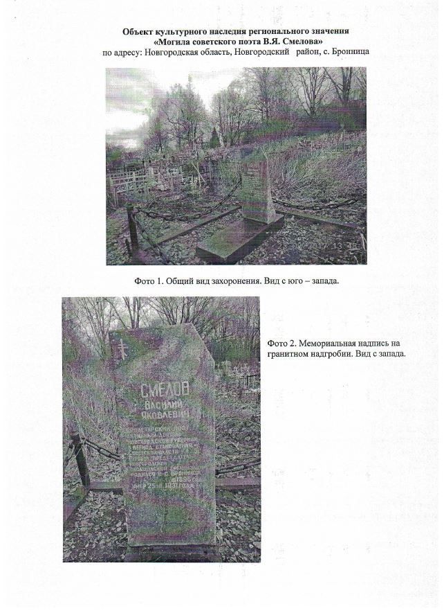 - захоронение и его местоположение на сельском кладбище;- останки усопшего;- конструктивное, архитектурно-художественное решение гранитного надгробия;- текст мемориальных надписи на гранитном надгробии:«СМЕЛОВ Василий Яковлевич пролетарский поэт активный деятель Новгородской губернии в период становления Советский власти Первый председатель Новгородской писательской организации родился в – с. Бронница в 1896 году умер 25.03.1931 года»