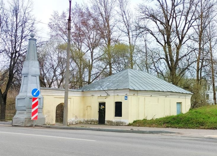 Расположение здания:•На Торговой стороне Великого Новгорода, на ул. Большая Московская, в пересечении с земляным оборонительным валом и ул. Панкратова. •Общие габариты и объемно - пространственная структура.Здание в целом:•Объемно - пространственная структура: композиция из двух небольших одноэтажных зданий прямоугольной формы в плане направление оси восток-запад, расположенных симметрично относительно улицы Большая Московская. К северо-западному углу восточного павильона примыкает кирпичная стенка с проходной аркой, обелиск с западной стороны, объединяет и, завершает композицию•Памятник представляет собой образец гражданской постройки начала XIX в., в стиле провинциального классицизма. Объект серьезно пострадал в годы Великой Отечественной войны. Восстановлен с частичной реставрацией в 1955 г.•Материал строительства и отделки: кирпич, штукатурка, побелка.•Количество, местоположение проемов.•Форма кровли - четырехскатная.•Существующая этажность – один.•Габариты - восточный павильон - 8,8 х 6,5м; стена с проходной аркой восточного павильона – 4,8м; высота обелиска – 7,7м.•существующий декор фасадов;•форма и размеры существующих проемов (в т. ч. заложенных);•планировка в пределах капитальных стен.Западный фасад (главный)•Фасад в три оси. Две прямоугольные ниши - с юга и севера, в центре - дверной проем, перемычка лучковая. Над проемом узкая ниша.•Центральная часть выступает из плоскости стены. Раскреповка в карнизной части. • Карниз простой из четырех полочек.Северный фасад•Фасад в две оконные оси, восточная и западная.•Западная часть фасада выступает из плоскости стены относительно восточной части. Раскреповка в карнизной части. Ниша в центре, с востока и запада две лопатки, не доходящие до карниза, по краям две лопатки с плечиками.•Восточная часть фасада - в нише проем с арочной перемычкой, симметрично оси проема две лопатки, из которых, западная не доходит до карниза, восточная - угловая.•Карниз простой из четырех полочек, имеет продолжение со стеной.•Стена с арочным сквозным проемом раскрепована в средней части.Восточный фасад (обращен к валу)•Карниз простой из четырех полочек.Южный фасад•Пять прямоугольных выступов в виде широких лопаток из них:•Средняя часть фасада выступает из плоскости стены. В центре широкий выступ, по краям две лопатки, не доходящие до карниза, в верхней части широкого выступа прямоугольная ниша.•Восточная часть фасада – ниша (прямоугольная, перемычка прямая) по краям две лопатки, из которых лопатка с западной стороны не доходит до карниза.•Западная часть фасада – в поле стены лопатка, не доходящая до карниза.•Карниз простой из четырех полочек, раскрепован, имеет продолжение со стеной проходной арки.•Стена с арочным сквозным проемом раскрепована в средней части.Колонна восточного павильона•Примыкает к стене с проходной аркой с запада. Квадрат в плане, в шесть ярусов с яблоком в завершении.Интерьеры:•Планировка помещений в пределах капитальных стен.•Центральный дверной проем (главный вход с востока) прямоугольной формы с прямой перемычкой.•Поперечная перегородка с дверным проемом, делит объем на две части. •Перекрытие плоское.