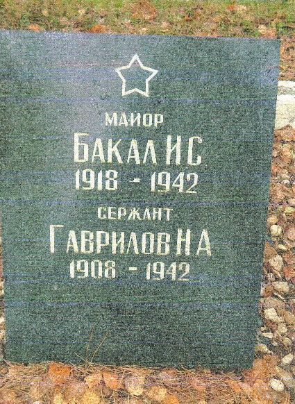 - захоронение и его местоположение;- останки усопших;- текст мемориальной надписи: «МАЙОРБАКАЛ И.С.1918-1942СЕРЖАНТГАВРИЛОВ Н.А.1908-1942».