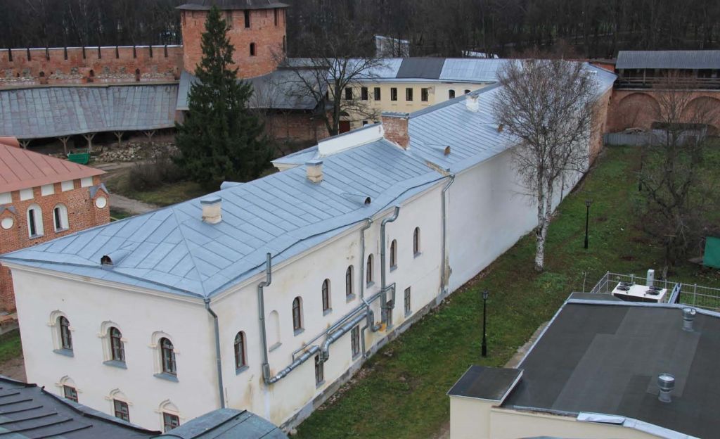 Градостроительные характеристики здания:- местоположение и градостроительные характеристики здания, его роль в композиционно-планировочной структуре комплекса Владычного двора и ансамбля Новгородского Кремля;- видовые раскрытия здания в структуре комплекса Владычного двора.Архитектурные характеристики и конструктивные элементы объекта:- объемно-пространственная композиция двухэтажного \"Г\"-образной формы в плане здания XV - XIX вв., включающее основной прямоугольный в плане объем XVII в., вытянутый от прясла крепостной стены к Софийскому собору, включающий в качестве ограждающих конструкций крепостные стены XV в., и западной крыло, состоящее из трех двухэтажных объемов XVIII - XIX вв., а также деревянное крыльцо с лестницей конца XX в. у западного фасада, в том числе высотные отметки по венчающим карнизам (с учетом реставрации 1960 - 1970-х гг.);- крыша, ее конфигурация, материал, характер кровельного покрытия, в том числе высотные отметки по конькам кровли, а также слуховые окна, вентиляционные трубы и их оформление (с учетом реставрации 1960 - 1970-х гг.);- композиционное решение и архитектурно-художественное оформление фасадов здания XV - XIX вв., включая размер, форму, местоположение и оформление оконных и дверных проемов, в том числе арочные ниши и щелевидные окна крепостной стены Владычного двора на восточном фасаде XV в.; прямоугольные ниши со ступенчатыми полочками в оформлении арочных окон первого этажа и колончатые наличники с килевидными перспективными кокошниками и пояском поребрика в тимпане окон первого и второго этажей западного фасада основного объема в редакции XVII в., включая портал парадного входа, фланкированный полуколонками и завершенный перспективным килевидным кокошником с киотом в тимпане и щелевидные окна сушила (чердака), а также двуступенчатые ниши с импостами и килевидными завершениями в оформлении прямоугольных и арочных окон фасадов южного крыла в редакции конца XVII в., и фигурная ниша-киот с живописным изображением святого, завершающий композицию фасадов основного объема венчающий профилированный карниз; элементы декоративного оформления фасадов западного крыла в редакции XVIII - XIX вв. включая прямоугольные ниши арочных и прямоугольных окон и ниш, в том числе со ступенчатыми полочками, а также венчающий профилированный карниз (с учетом реставрации 1960 - 1970 гг.);- материал и характер отделки фасадных поверхностей: гладкая штукатурка с побелкой и окраской;- колористическое решение фасадов (уточняется по результатам реставрационных исследований и раскрытий);- характер столярных заполнений оконных и дверных проемов в редакции XVIII - XIX вв.;- пространственно-планировочная структура здания в пределах капитальных стен, прямоугольных и арочных проемов, перекрытий XV - XVII вв., XVIII - XIX вв.;- капитальные стены и перекрытия XV - XVII вв., XVIII - XIX вв., их конструкция и материал, включая сводчатые перекрытия с распалубками;- лестницы XVIII - XIX вв., включая внутристенные у прясла крепостной стены, их местоположение, конструкция, материал и оформление;- архитектурно-художественное оформление интерьеров, включая экспозиционные зондажи с фрагментами открытой каменной и кирпичной кладки, арочных проемов, ниш и рогатых зубцов крепостных стен XV в. и элементов декора, а также профилированные карнизы потолков в редакции XIX в., покрытие полов плитам