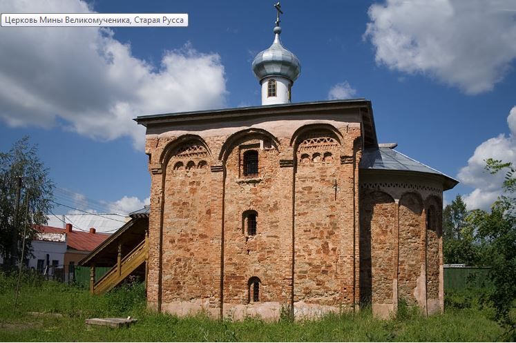 А. Градостроительная охрана: Церковь Мины расположена в южной части города Старая Русса, на перекрёстке улиц Георгиевской и Писательского переулка.Б. Архитектурная охрана:Здание в целом:Габариты, объемно-пространственная композиция, силуэт.Кладка стен, столбов, сводов, арок, декора.Количество, габариты, местоположение проёмов, форма крыши.Материал строительства и отделки стен из красного ракушечника, серого известняка, из красного кирпича свод апсиды, предалтарная арка, лопатки, оконные проёмы, порталы, ниши, декоративные детали. Памятник четырехстолпный одноглавый одноапсидный, с подцерковьем. Линейные размеры в плане 9 х 9 м, длина с апсидой 12 м, высота от уровня земли до верха закомары 8, м.Трехчастное деление лопатками, 2-х уступчатые арочные закомары с одинаковым пролётом и высотой, раскреповка угловых лопаток до уровня пят закомар.Количество, форма, размеры местоположение проемов.2 типа окон расположены в три яруса – прямоугольные проёмы щелевидной формы, помещенные в нишу с арочной перемычкой. Второй тип большего размера (напоминает окна XVI в.) с пологой арочной перемычкой, в прямоугольной нише с полочкой. Дверные проёмы с арочной перемычкой.Декор из рядов: «бегунца» и «поребрика», 2-х уступчатые полукруглые шишки в тимпанах закомар, вертикальные тяги с полуциркульным завершением (апсида). Западный фасад: 4 лопатки делят стену на три равные части (основной объём); угловые лопатки раскрепованы, в верхней части образуют полный угол;3 уступа в уровне пят закомар (все лопатки); 2-х уступчатые, полукруглые закомары, верх в одном уровне;два ряда поребрика и бегунца в центре тимпана – перебиты большим вкладным каменным крестом (северное прясло); небольшой каменный крест, в круглой нише (тимпан центрального прясла); фрагмент из рядов поребрика и бегунца (южное прясло), такие же два креста расположены в уровне 2-го яруса северного и южного прясла; прямоугольный оконный проем, щелевидной формы помещен в нишу с арочной перемычкой в центральном прясле (подцерковье), такой же проем в тимпане южного прясла (3-й ярус);дверной проем, с четвертью без откосов, перемычка арочная, (вход в основной объём, центральное прясло); 2 яруса металлических анкеров от внутристенных и воздушных связей в плоскости стен и лопаток;Южный фасад: 4 лопатки делят стену на три равные части (основной объём); 3 уступа в уровне пят закомар (все лопатки); угловые лопатки раскрепованы, в верхней части образуют полный угол;2-х уступчатые, полукруглые закомары, верх в одном уровне;три полукруглые 2-х уступчатые ниши, выше ряды поребрика и бегунца (тимпаны восточного и западного прясла), прямоугольный оконный проем, щелевидной формы помещен в нишу с арочной перемычкой (1-й, 2-й ярус, центральное прясло), большой проём с арочной перемычкой в прямоугольной нише с полочкой (3-й ярус, центральное прясло);2 яруса металлических анкеров от внутристенных и воздушных связей в плоскости стен и лопаток;Северный фасад: 4 лопатки делят стену на три равные части (основной объём); 3 уступа в уровне пят закомар (все лопатки); угловые лопатки раскрепованы, в верхней части образуют полный угол;2-х уступчатые, полукруглые закомары, верх в одном уровне;две полукруглые 3-х уступчатые ниши (тимпаны восточного и западного прясла);небольшой каменный крест (уровень 2-го яруса, западное прясло); прямоугольный оконн