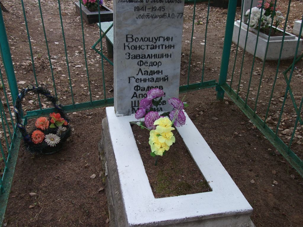 - захоронение и его местоположение в структуре гражданского кладбища;- останки усопших;- мемориальный текст: \"Вечная память павшим в годы войны 1941-1945 летчики Б.А.О. 77 Волоцугин Константин Завалишин Федор Ладин Геннадий Фадеев Аполлон Шарапов Михаил\";- мемориальный текст на гранитной плите: \"КОЗЛОВ НИКОЛАЙ ИВАНОВИЧ\";- мемориальный текст на гранитной плите: \"ХЛЕБКО НИКОЛАЙ ВАСИЛЬЕВИЧ\".